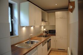 Die renovierte Einbauküche verfügt über einen Backofen, Herd, Microwelle, Geschirrspüler sowie Waschmaschine. Selbstverständlich steht ein Kühlschrank mit Gefrierfach und Kaffeemaschine zur Verfügung.