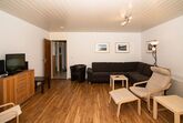 Das nach Süden ausgerichtete Wohnzimmer lädt mit einem Sofa und einem Essbereich für sechs Personen zum gemütlichen Essen und Zusammensein ein. Am Panoramafenster können Sie gemütlich in der Sonne sitzen und den Blick auf die Alpspitz genießen. Zu der Ausstattung gehören unter anderem ein Fernsehgerät und ein Radio/CD/MP3/USB Gerät.