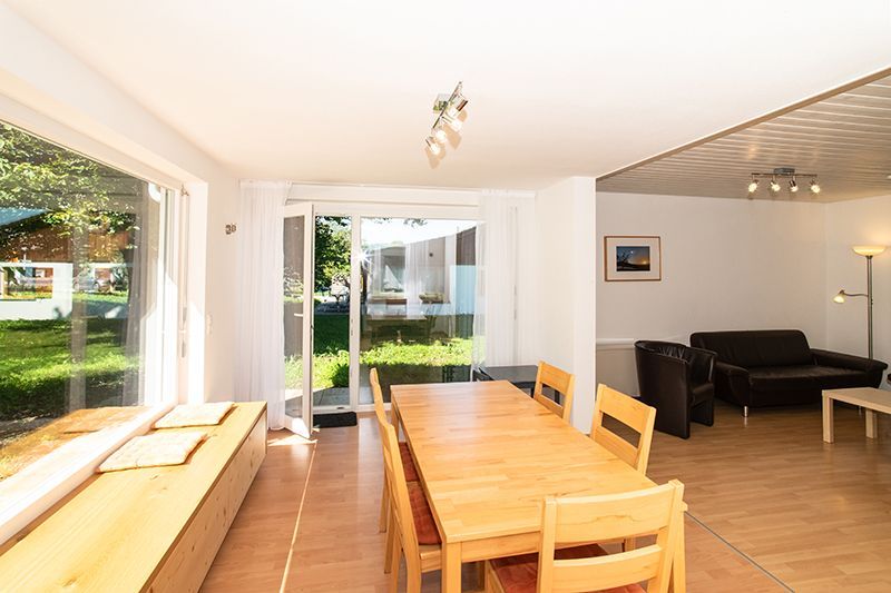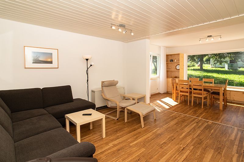 Das nach Süden ausgerichtete Wohnzimmer lädt mit einem Sofa und einem Essbereich für sechs Personen zum gemütlichen Essen und Zusammensein ein. Am Panoramafenster können Sie gemütlich in der Sonne sitzen und den Blick auf die Alpspitz genießen. Zu der Ausstattung gehören unter anderem ein Fernsehgerät und ein Radio/CD/MP3/USB Gerät.