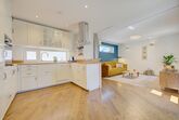Großzügige Wohn-Ess-Küche – offenes Raumkonzept mit moderner Küche & Halbinsel, stilvollem Zylinder-Dunstabzug und viel Platz für gemeinsame Kochabende