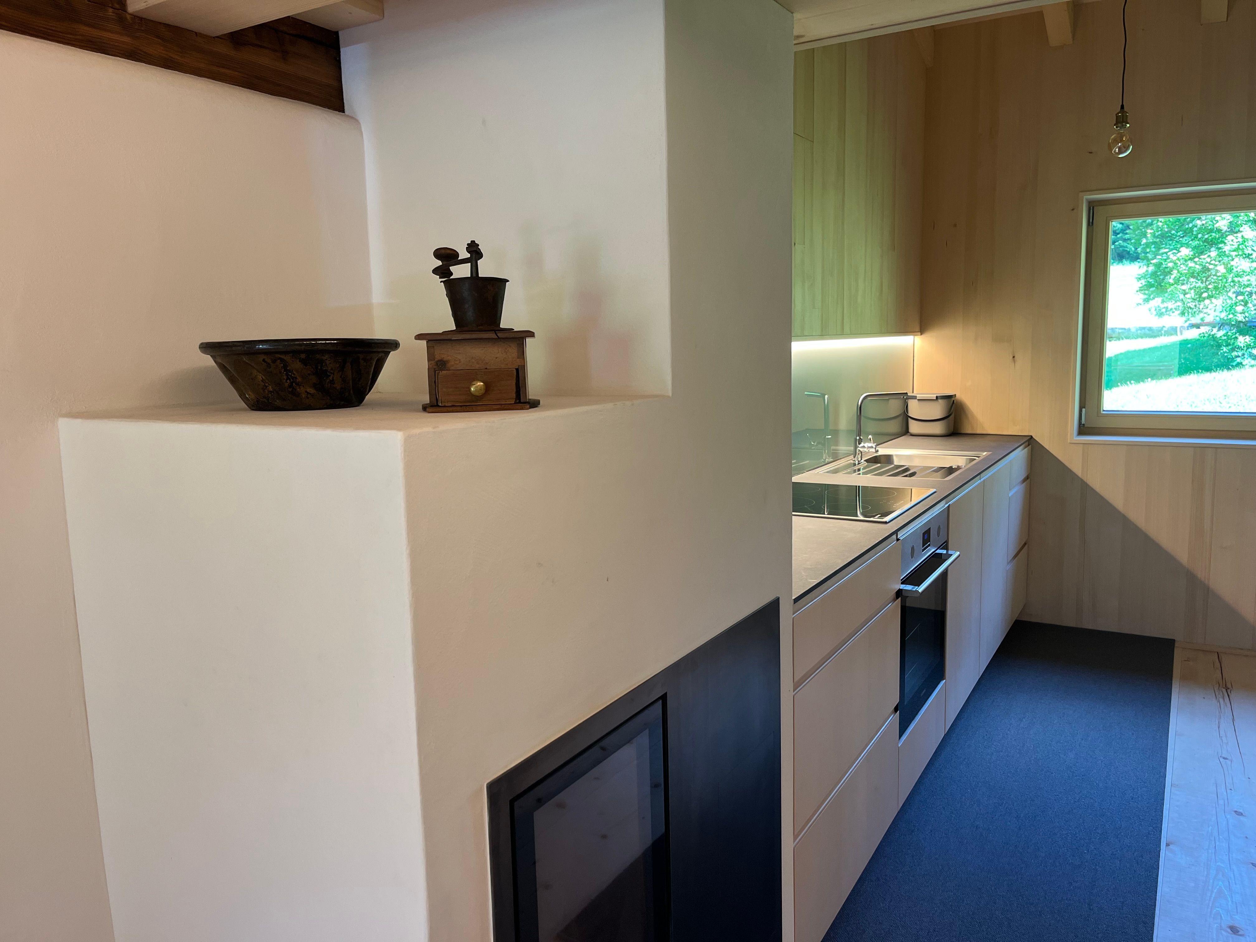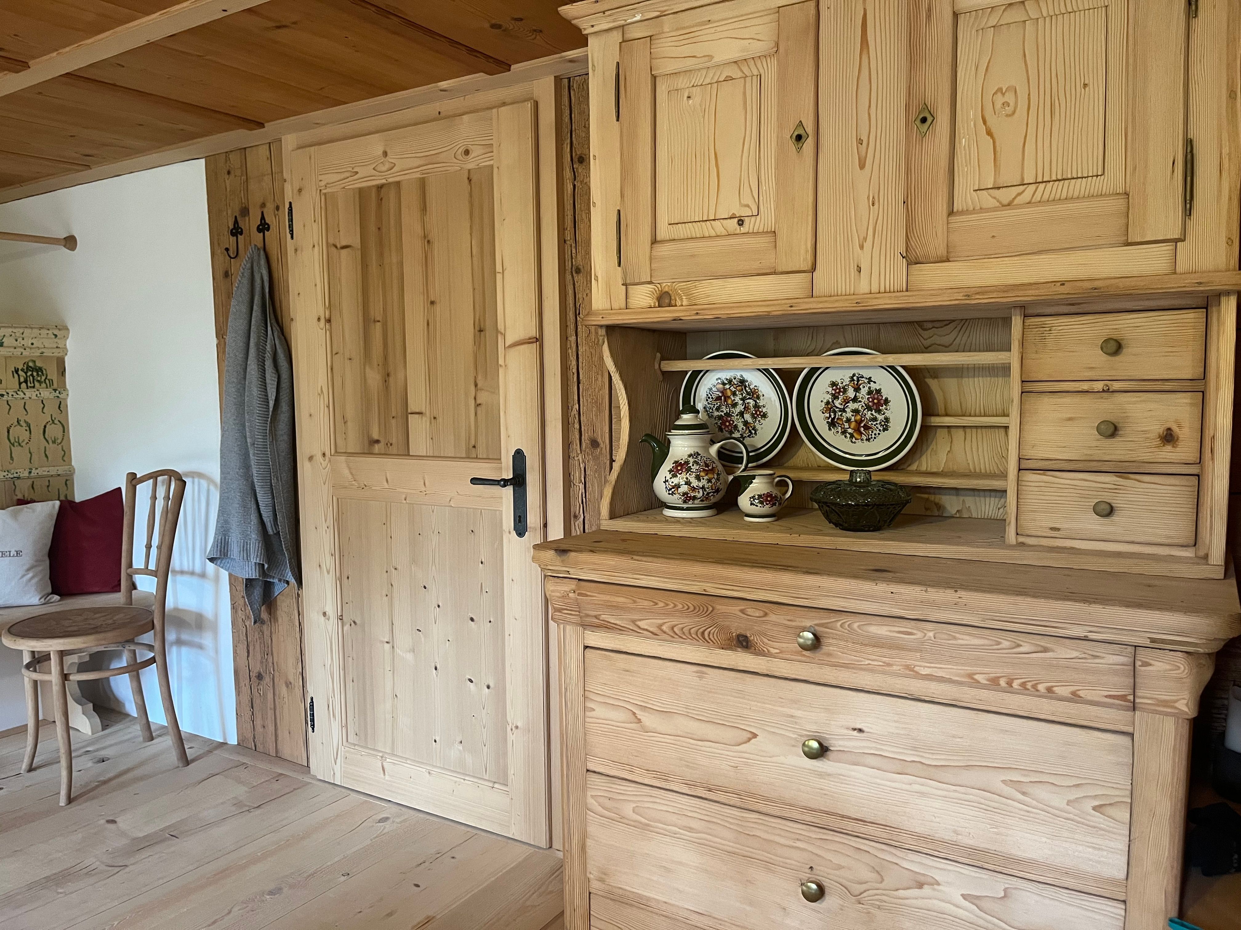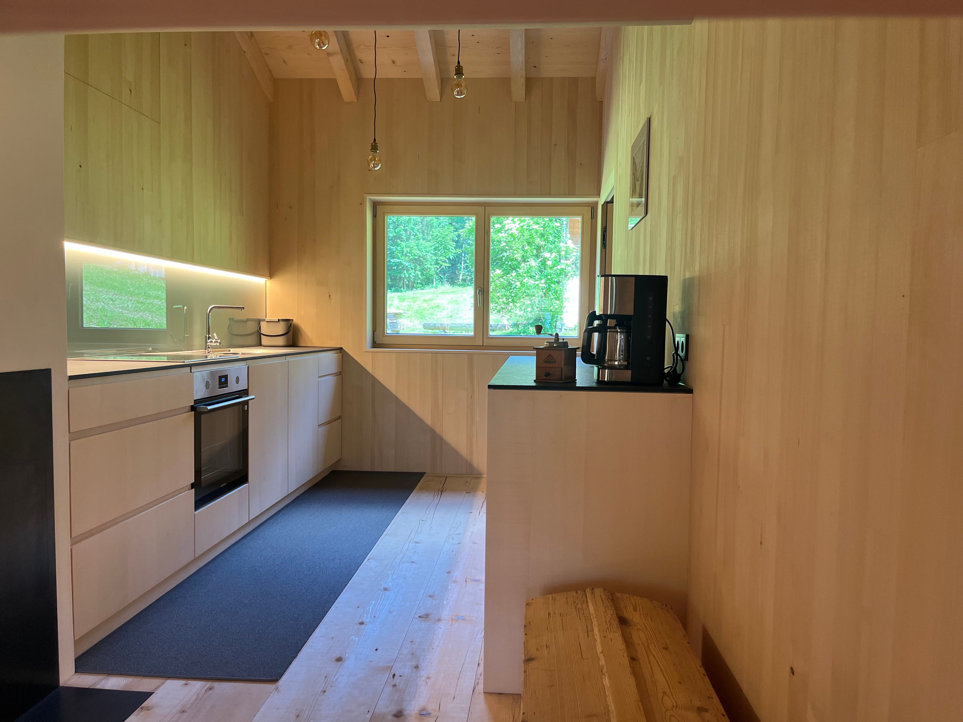 Auf zwei Ebenen befinden sich / eine voll ausgestattete Wohnküche / zwei Schlafzimmer mit Doppelbett / ein Schlafzimmer mit 2 separaten Betten / ein Bad mit WC und Dusche / eine gemütliche Wälder Stube (Wohnzimmer) mit Kachelofen und genügend Holz/ und ein Schopf (offene Veranda)