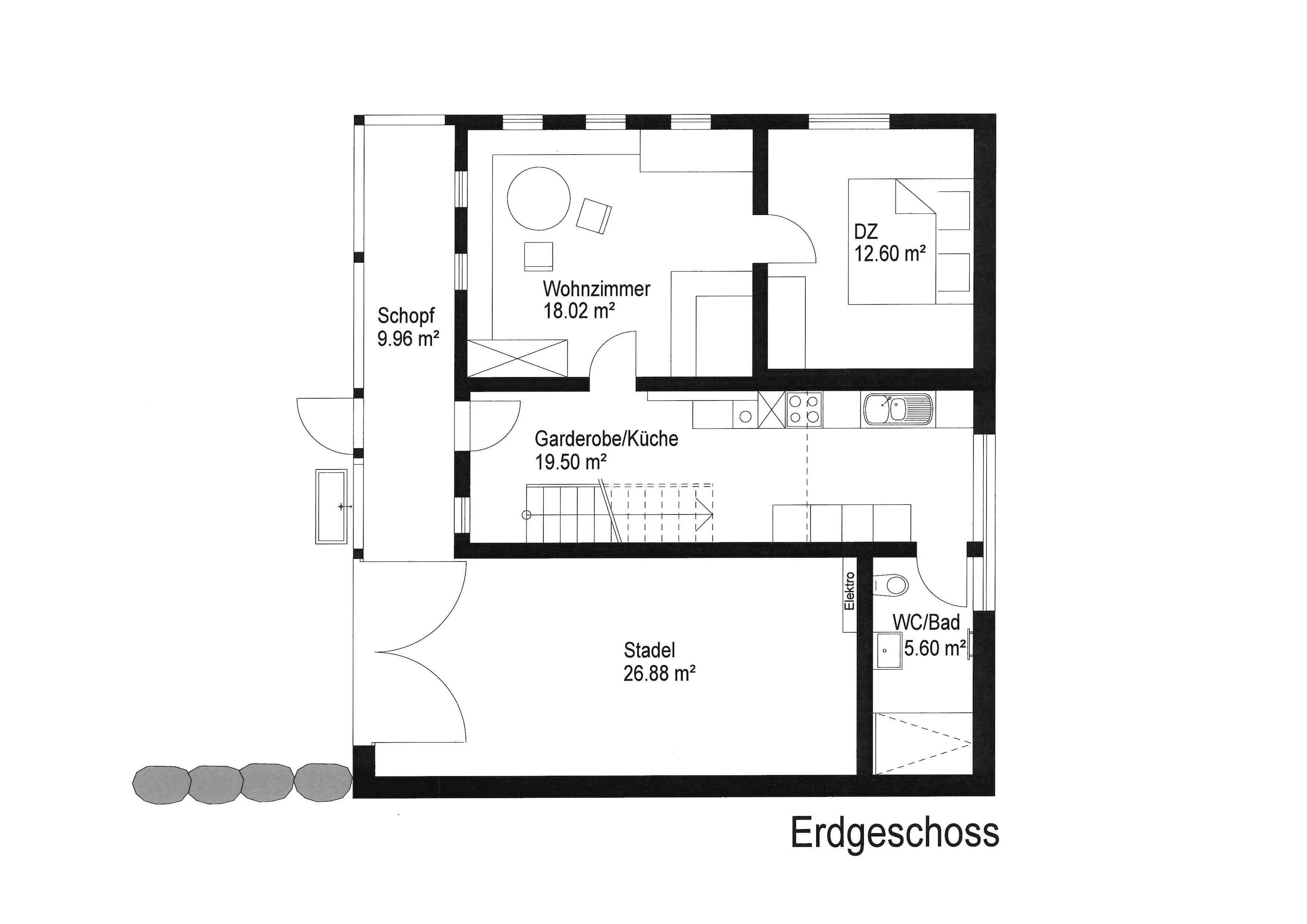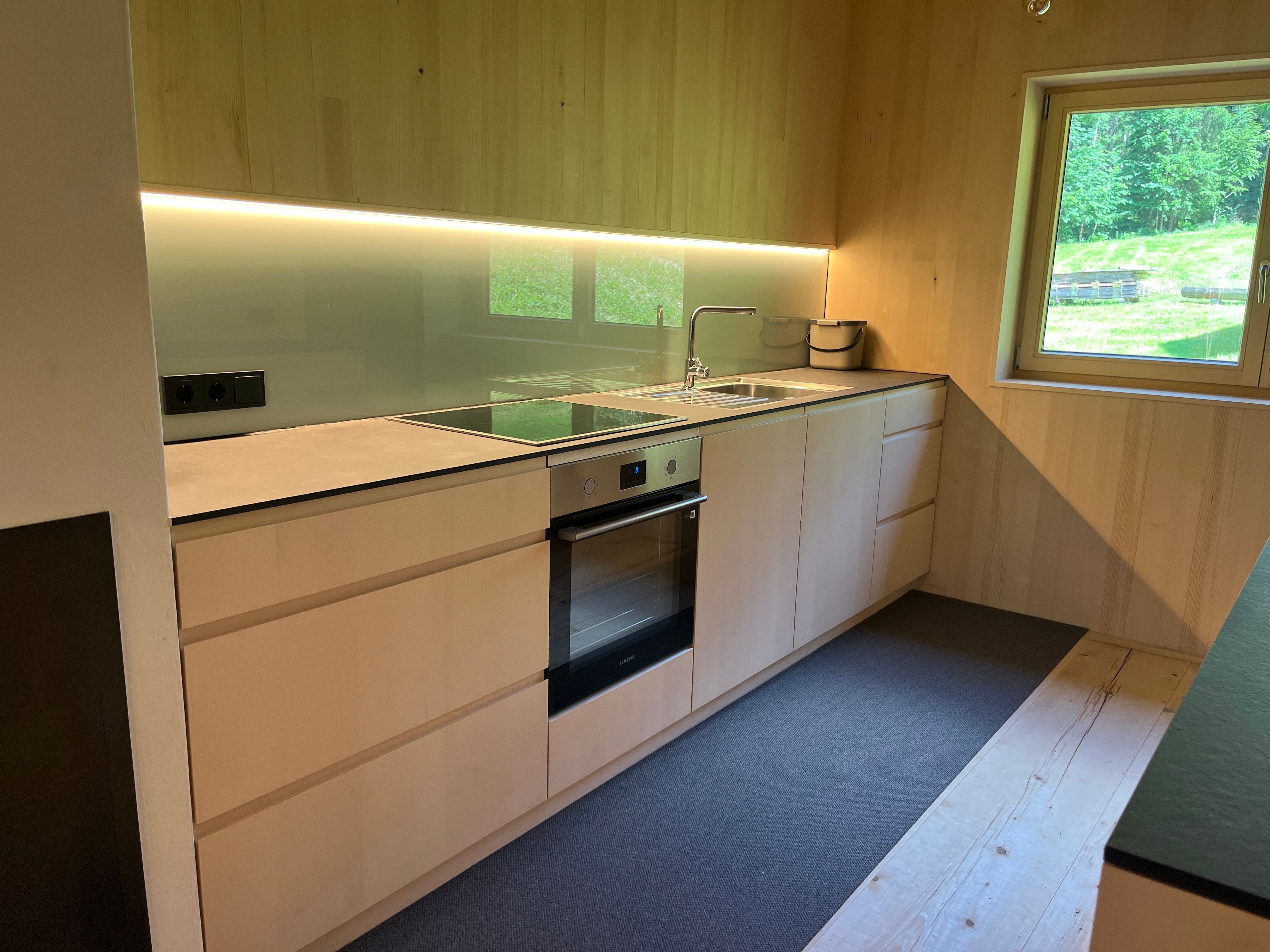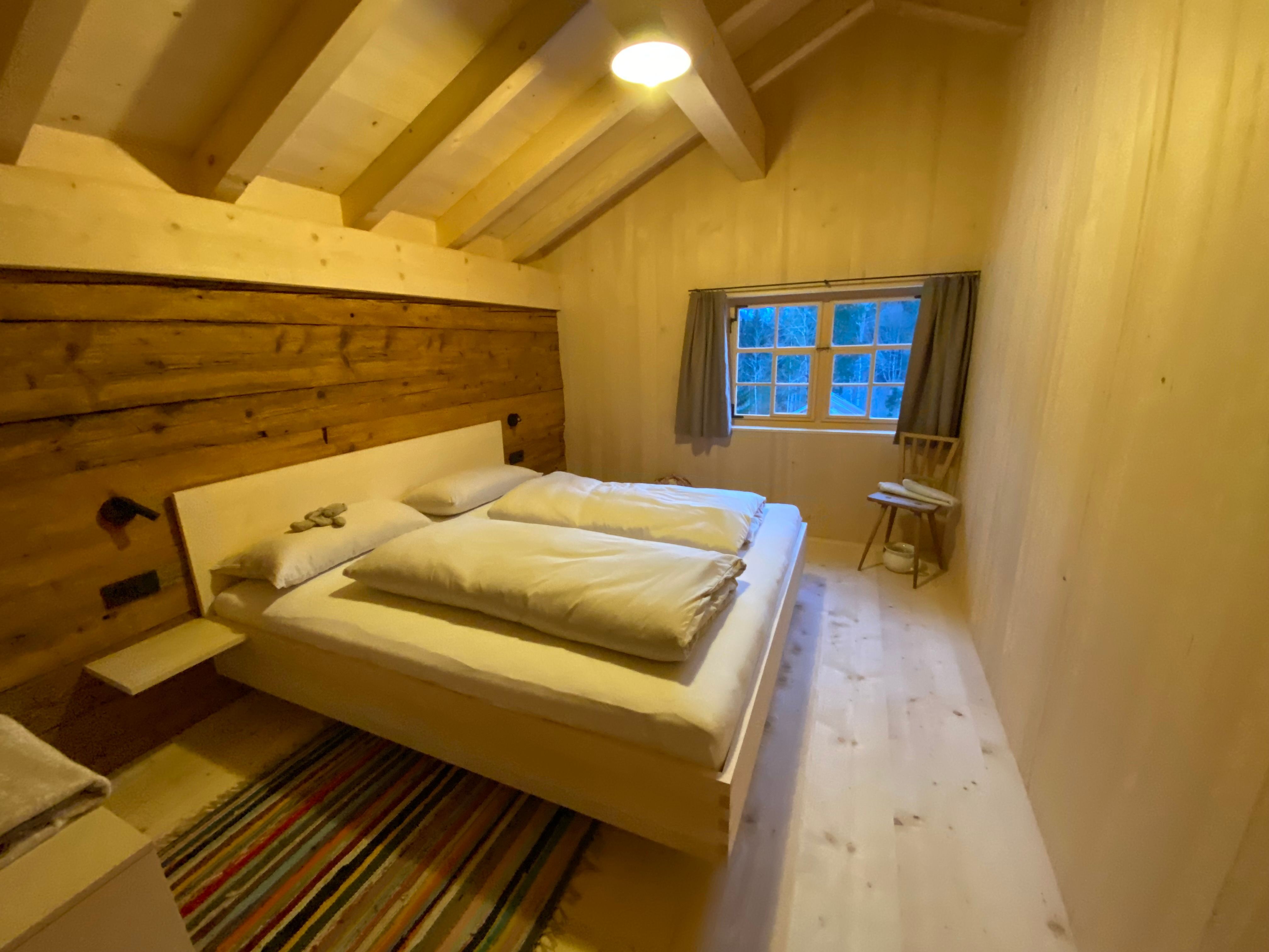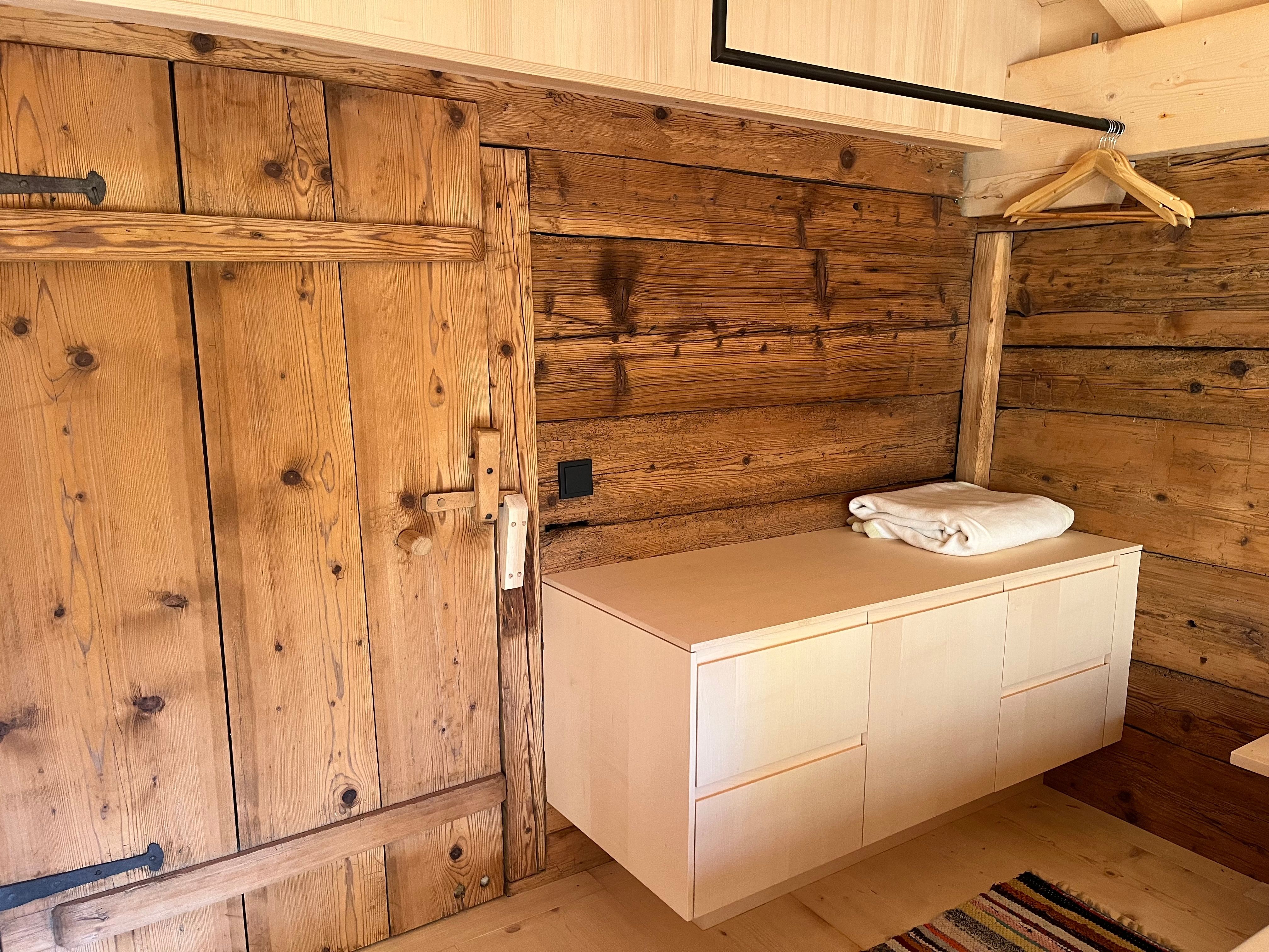 Auf zwei Ebenen befinden sich / eine voll ausgestattete Wohnküche / zwei Schlafzimmer mit Doppelbett / ein Schlafzimmer mit 2 separaten Betten / ein Bad mit WC und Dusche / eine gemütliche Wälder Stube (Wohnzimmer) mit Kachelofen und genügend Holz/ und ein Schopf (offene Veranda)