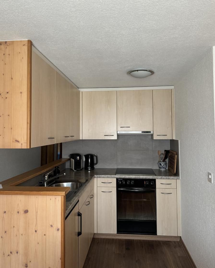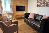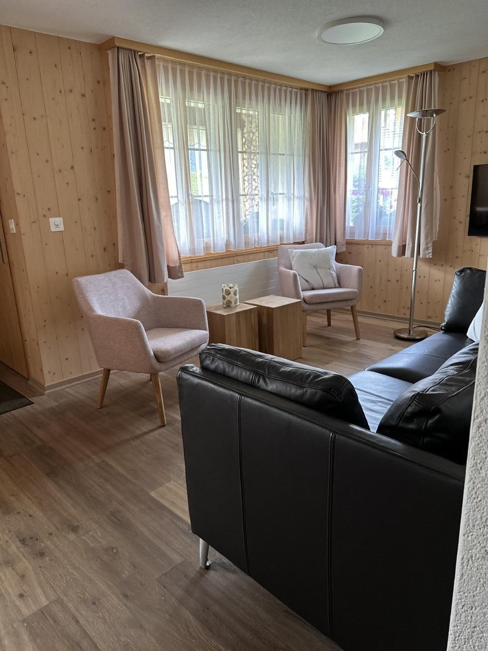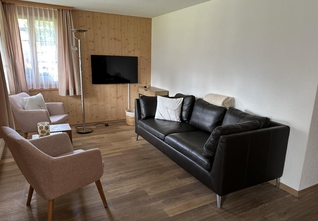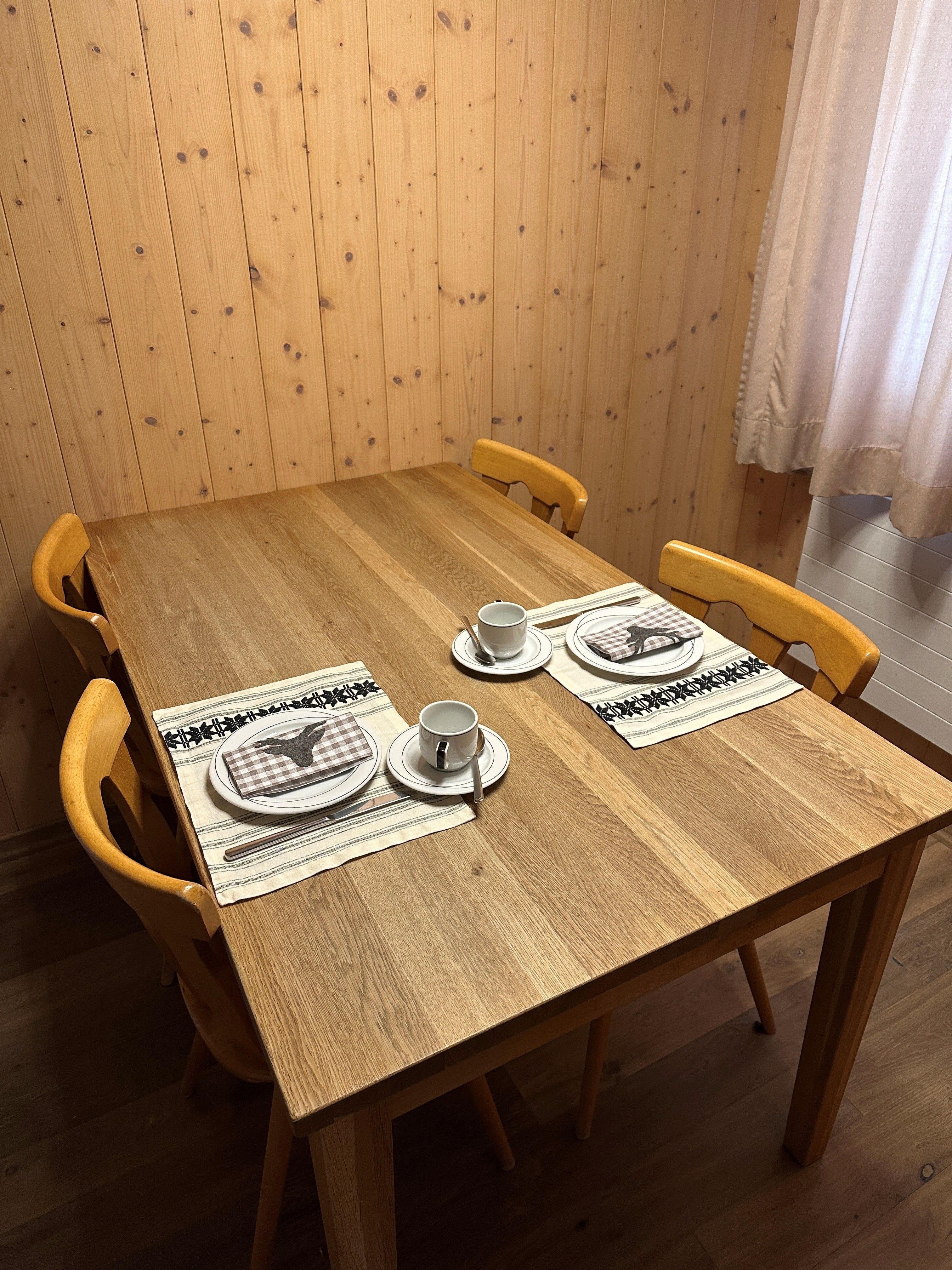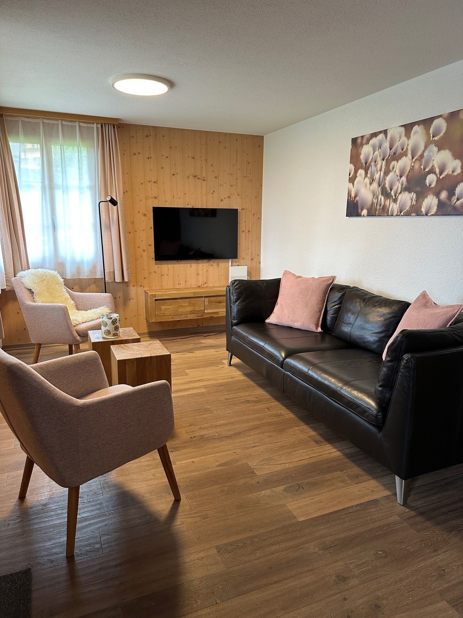 Innen besticht die Wohnung durch eine hochwertige Ausstattung, die keine Wünsche offenlässt: Eine gut ausgestattete Küche mit Glaskeramik-Kochfeld, Kühlschrank, Backofen sowie einer Auswahl an Kaffeemaschinen (Filter und Kapsel), einem Wasserkocher, einem Käsefondue-Set und einem Raclette Ofen. Im Wohnzimmer lädt eine bequeme Lederpolstergruppe zum Entspannen ein, ergänzt durch Stoffsessel, Beistelltische, Swisscom TV und WLAN. Die Schlafzimmer sind einladend gestaltet, eines mit einem Doppelbett, das andere mit zwei Einzelbetten, die zu einem großen Bett kombiniert werden können, neben praktischen Kleiderständern und Nachttischen.
