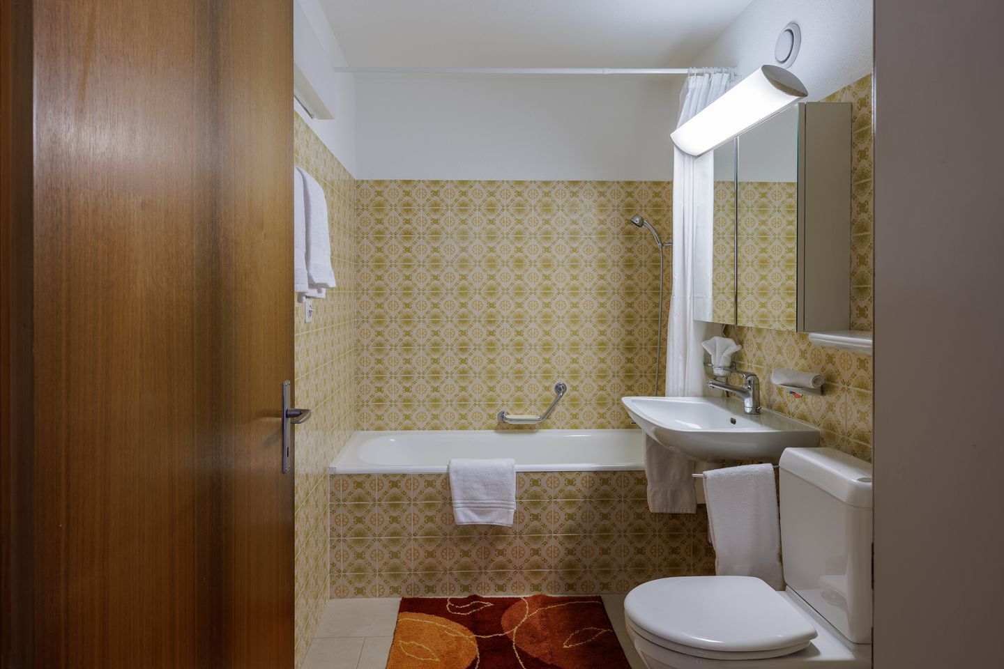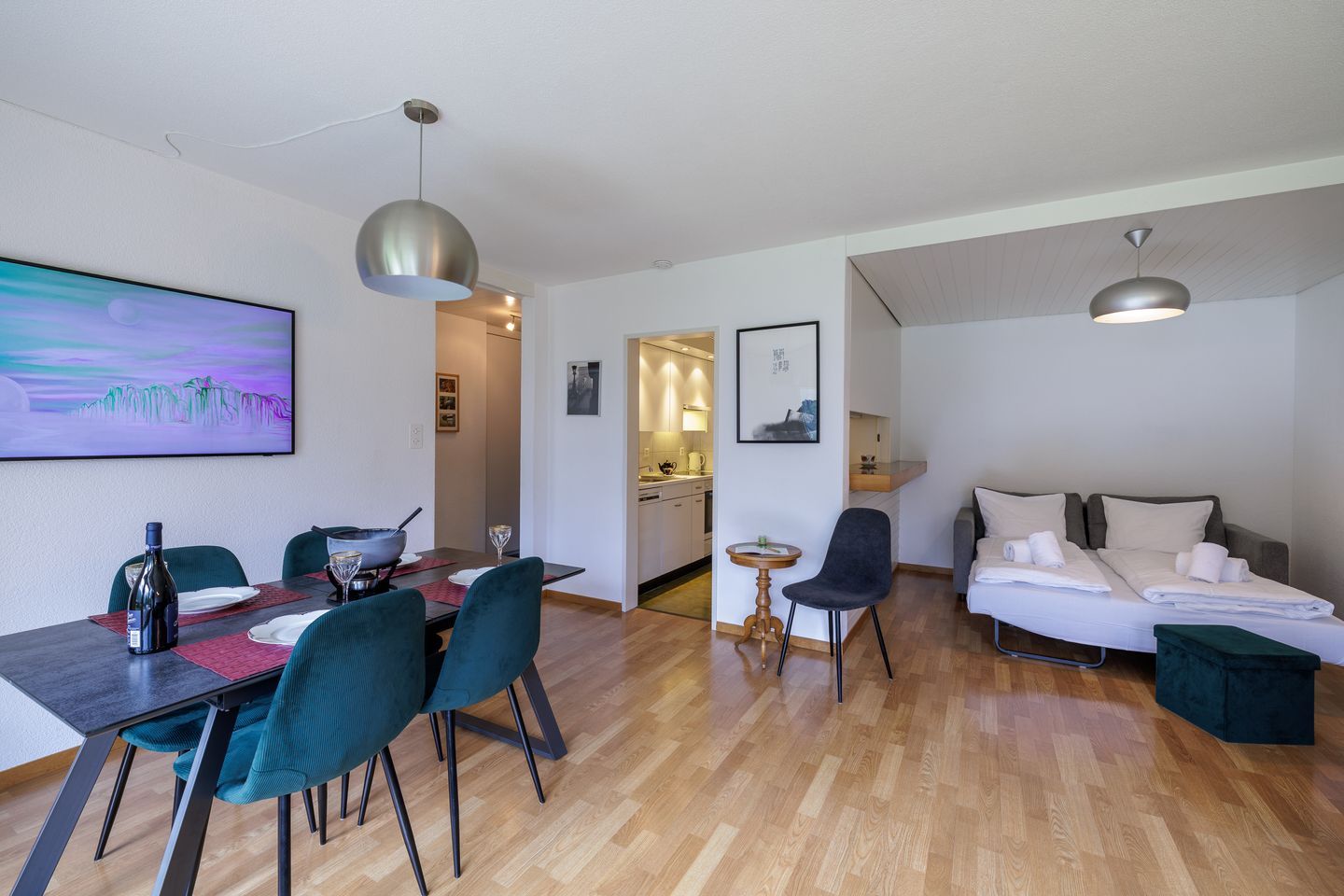 Die Wohnung verfügt über eine Küche mit Geschirrspülmaschine, Herdplatte, Doppelschlafzimmer, Schlafsofa (für zwei Personen geeignet), Dusche/WC/Lavabo, de Longhi-Dolce-Gusto-Kaffeemaschine, Flat Screen-TV, Gratis-WLAN, eigener Tiefgaragenplatz u.v.m.