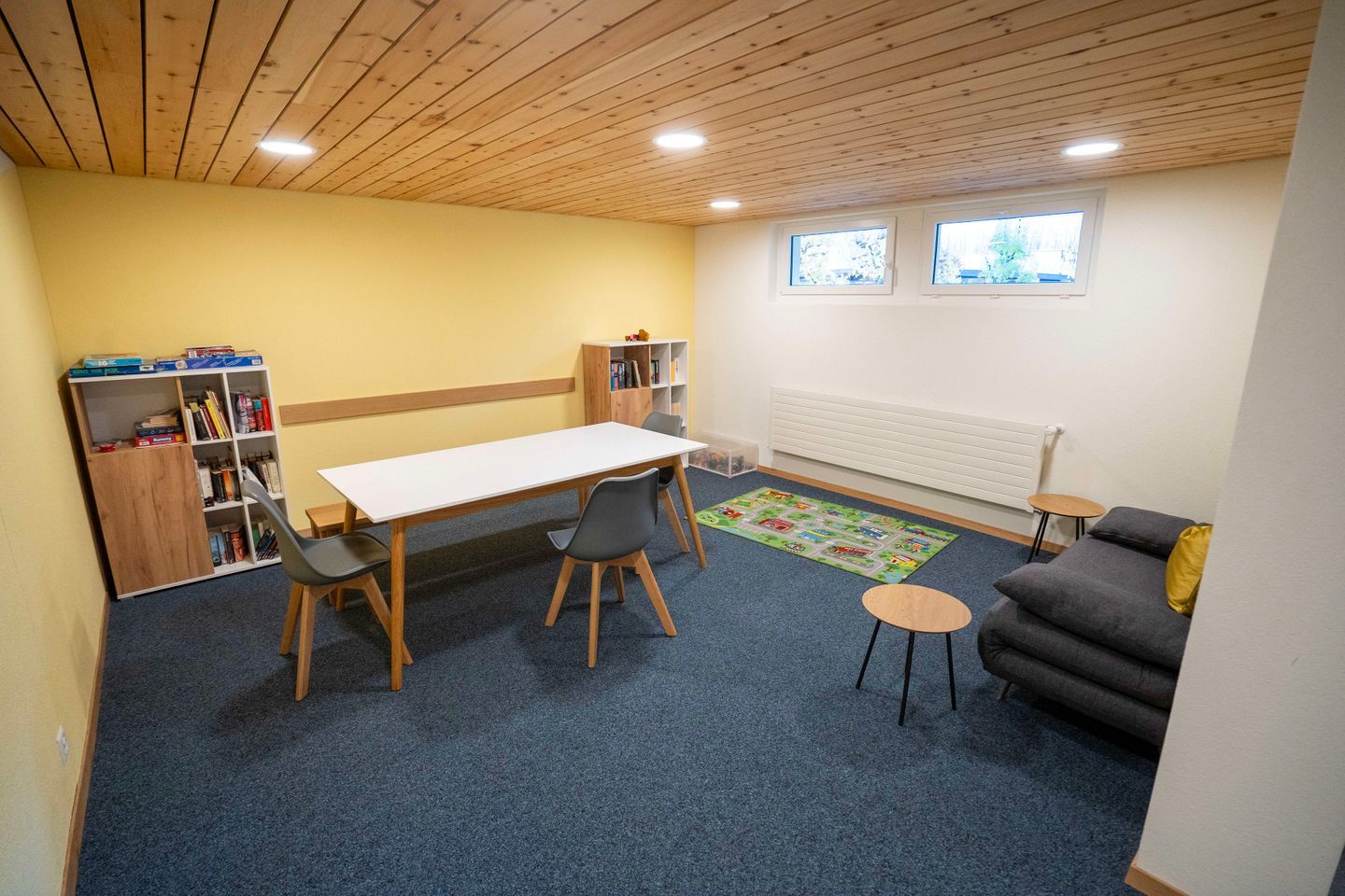 Grosszügiges Hallenbad mit Panoramablick auf die Berge, 20m Becken mit Nichtschwimmerbereich im Haus das gratis benutzt werden kann. Sauna für Exklusivnutzung (kostenlos bei allgemeiner Öffnungszeit). Ein Spielraum mit Tischtennis und Tischfussball ist vorhanden. Ski-/ Veloraum ist bei der Autoeinstellhalle. Grosse Wiesen mit Bäumen vor dem Haus.