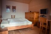 Im Obergeschoss befinden sich 2 Schlafzimmer (1. Zimmer: Stockbett mit zwei Betten, 2. Zimmer: Doppelbett und TV), Wohn- und Esszimmer, TV, Radio, Telefon, Internet, Küche (bestens ausgerüstet mit Steamer, Backofen, Geschirrspüler, Kühlschrank und Tiefkühler, Racletteofen, Fondue-Rechaud, Mixer, Toaster, Mikrowelle, Kapsel-Kafféemaschine (Dolce Gusto)), Nasszelle mit WC/Lavabo, Dusche und Badewanne.