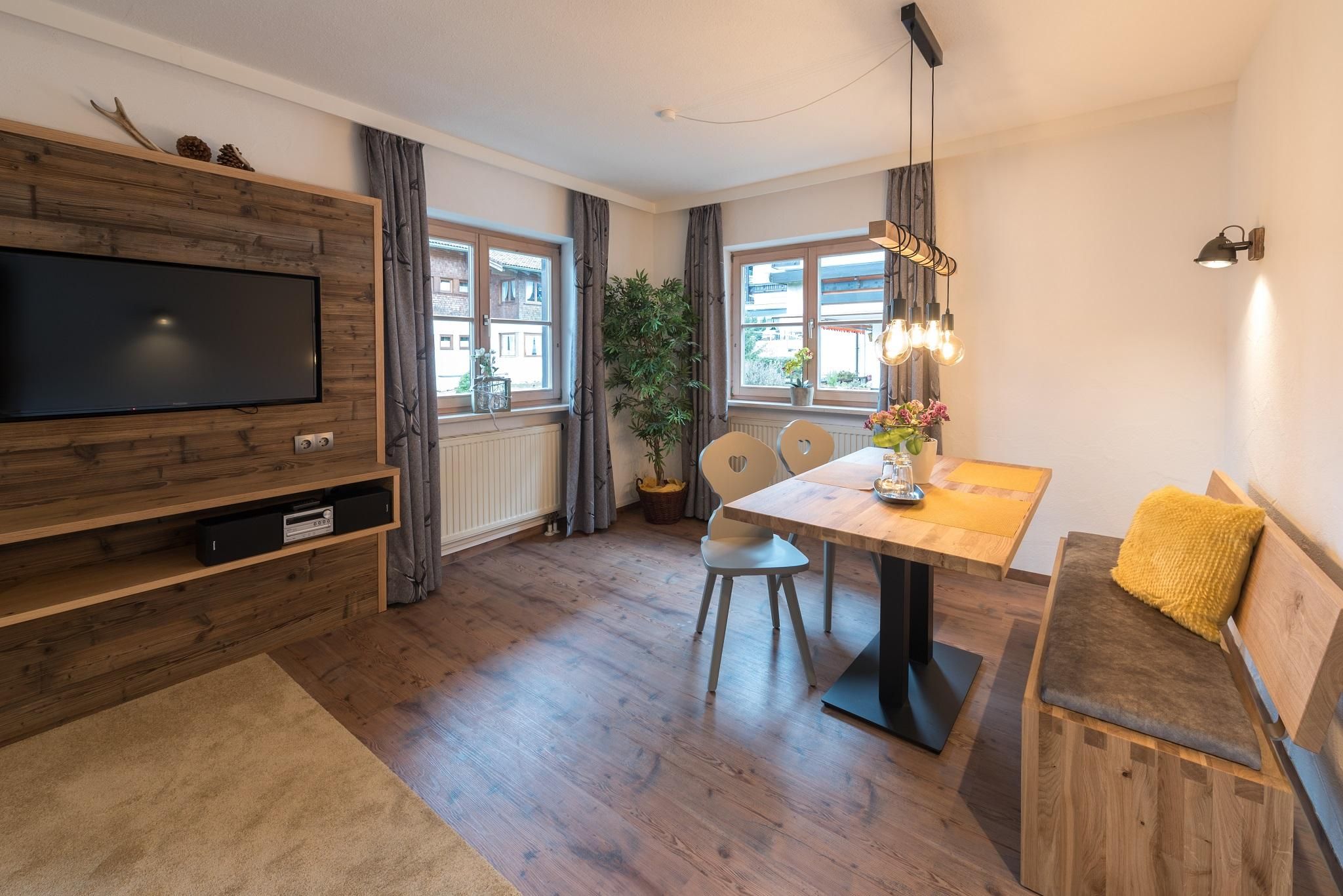 Unsere neu gestaltete Ferienwohnung bietet ein modernes Urlaubszuhause im alpenländischen Stil. Die Wohnung liegt ruhig in unserem Haus am Nägelesberg ca. 100 Meter vom Hotel entfernt und verfügt über einen Süd- und Westbalkon.