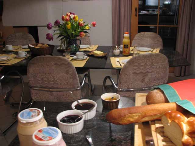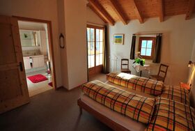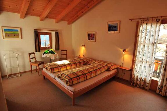 Die 3 ruhigen und gemütlichen Doppelzimmer laden Sie zum einem erholsamen Aufenthalt ein. Das grosse Doppelzimmer mit je einem Süd-und einem Westbalkon mit herrlicher Aussicht auf die Berge und einem luxuriösen Bad/WC ist das Bijou des Hauses. Das mittlere (ohne Balkon) und das kleinere Doppelzimmer (Südbalkon) teilen sich die grosszügige Dusche/WC. Im hellen Speisezimmer der Familie wird Ihnen ein feines Frühstück serviert. Kleine Kaffee/Teestation und gratis WLAN finden Sie im Haus.
