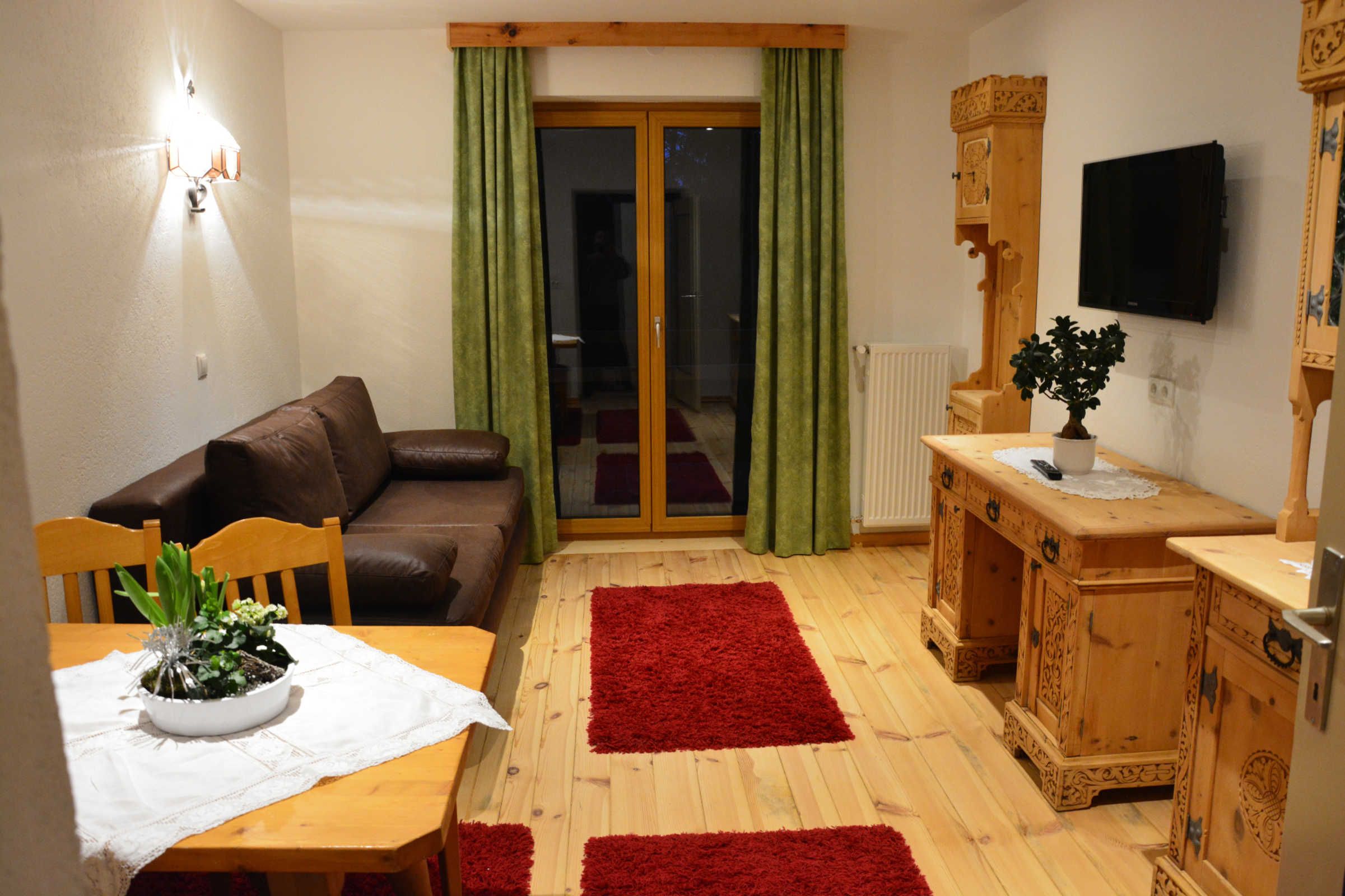 Die Ferienwohnung besteht aus einem Wohn-Schlafzimmer mit ausziehbarer Doppelcouch, Sitzecke, Küchenblock (mit Kaffeemaschine, Mikrowellenherd) und 2 SAT Fernseher, einem mit hellen Bauernmöbeln eingerichtetem Schlafzimmer, einem Vorraum, WC und Dusche mit Haarfön. Sie bietet Platz für 2 bis zu 6 Personen. Von der Wohnung aus haben Sie einen Balkon mit Blick nach Süd-Osten direkt ins Tiergehege.