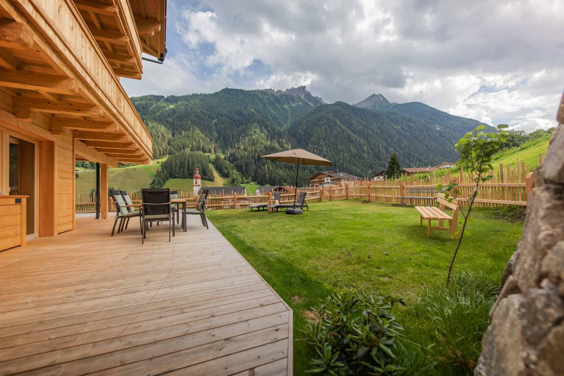 Die Ferienwohnung Sonnentanz in Neustift im Stubaital begeistert mit einem großzügigen Holzdeck und einer einladenden Terrasse, die einen malerischen Blick auf die umliegende Bergwelt eröffnen – perfekt für Entspannung und Naturgenuss.