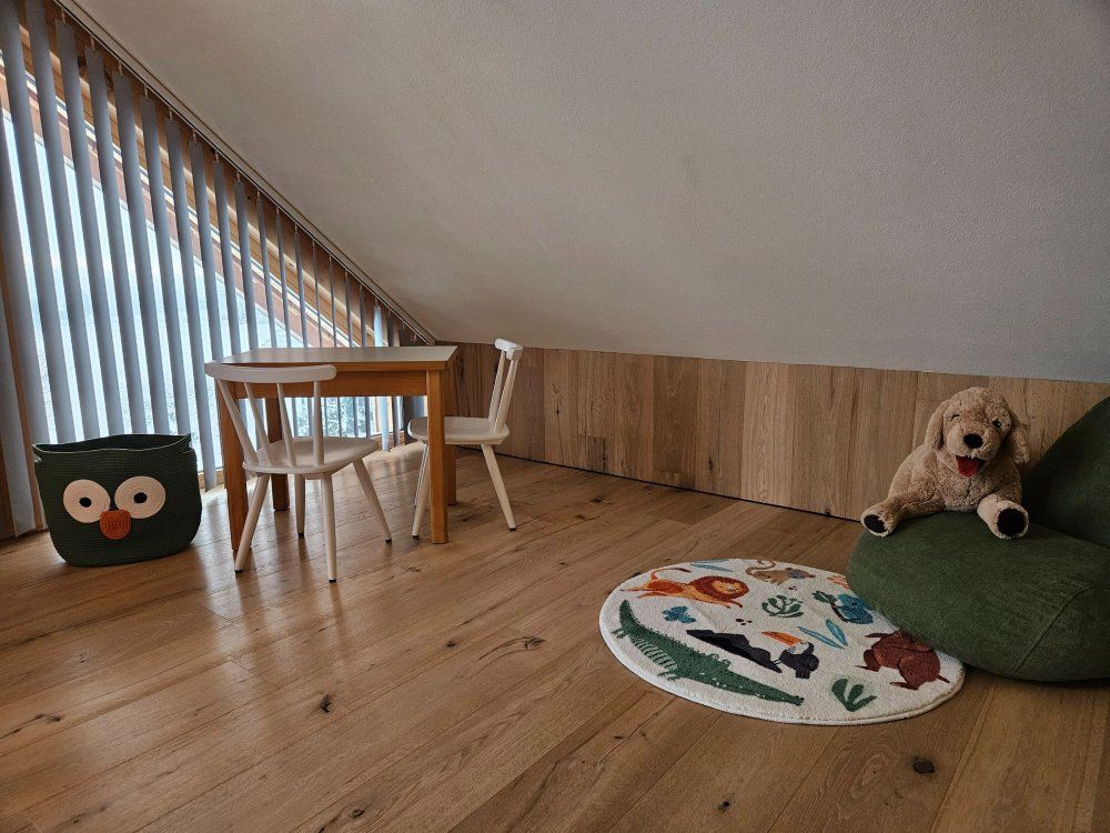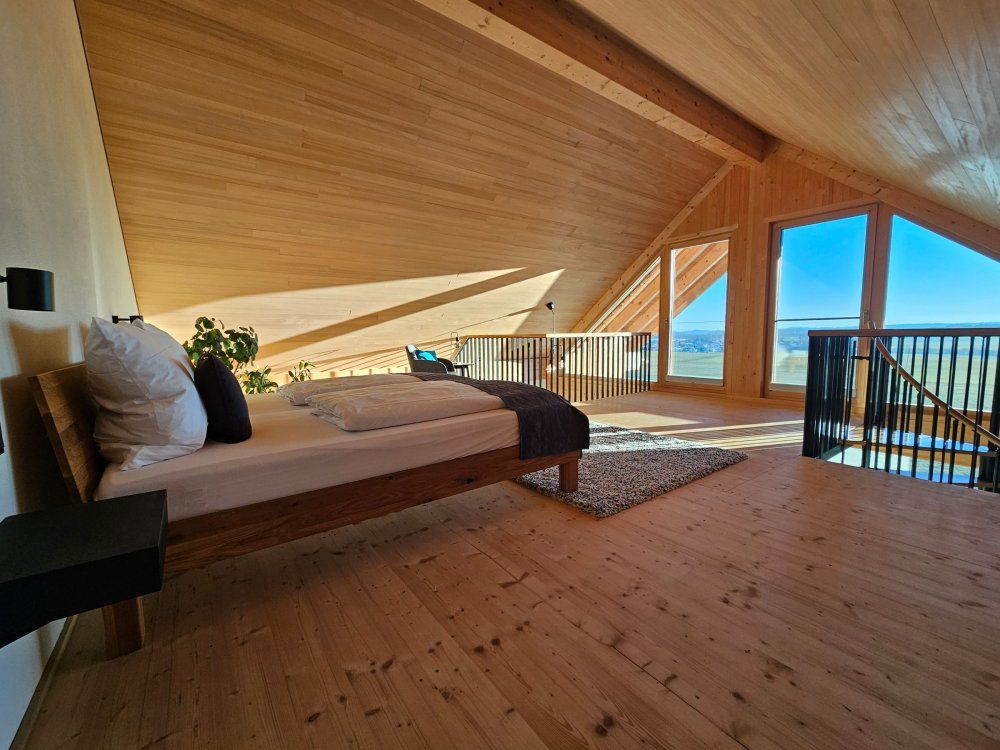 Die neue modern eingerichtete und lichtdurchflutete Galerie-Wohnung verfügt über zwei Schlafzimmer mit Doppelbett und Weitblick auf die Wiesen und Felder, über ein liebevoll eingerichtetes Kinderzimmer für bis zu 2 Kinder (Kinderbett 1,90 x 0,90). Ein weiteres Kinderbett (1,20 lang) kann auf Wunsch zur Verfügung gestellt werden.