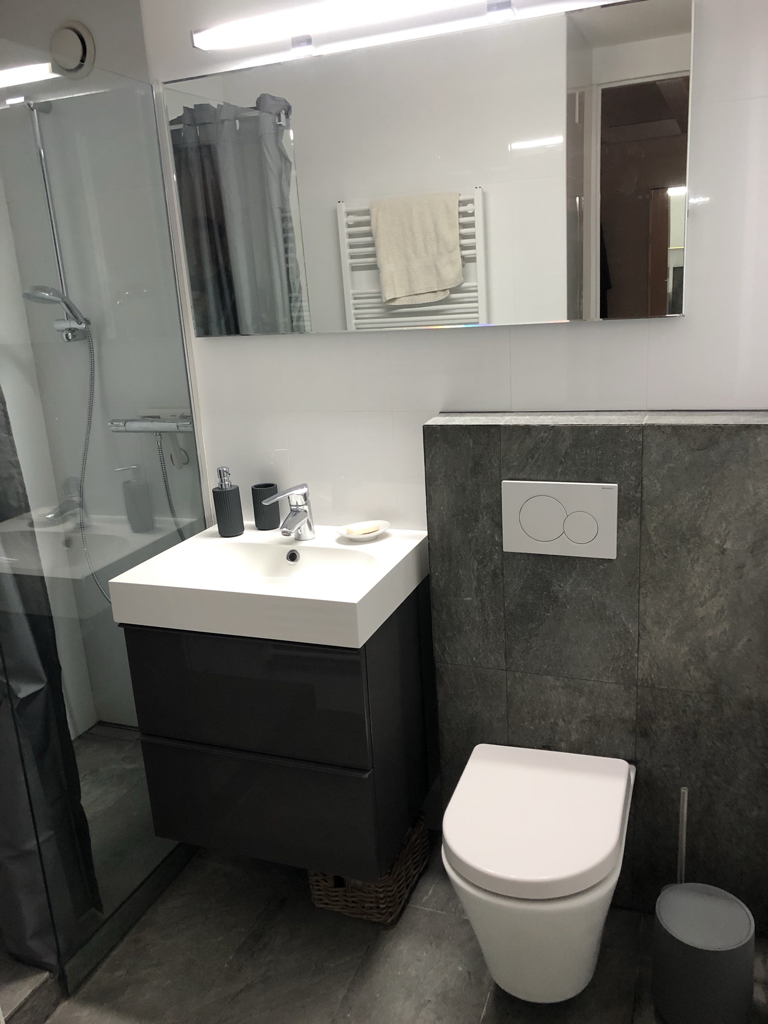 In der Wohnung sind zudem zwei Badezimmer (mit Haartrockner), ein Cheminée, Flatscreen TV und eine komplett eingerichtete Küche mit Fondue-Set, Kaffeefiltermaschine, Kühlschrank mit Tiefkühlfach und Toaster vorhanden.Im Mehrfamilienhaus, in welchem sich auch die Ferienwohnung befindet, gibt es ein Hallenbad und eine Sauna, direkt nebenan ein Tennisplatz für die Anwohner. Auch die Parkplätze sind unmittelbar beim Haus zu finden.