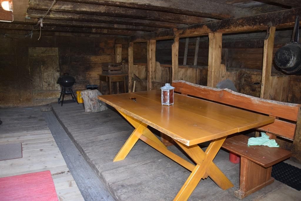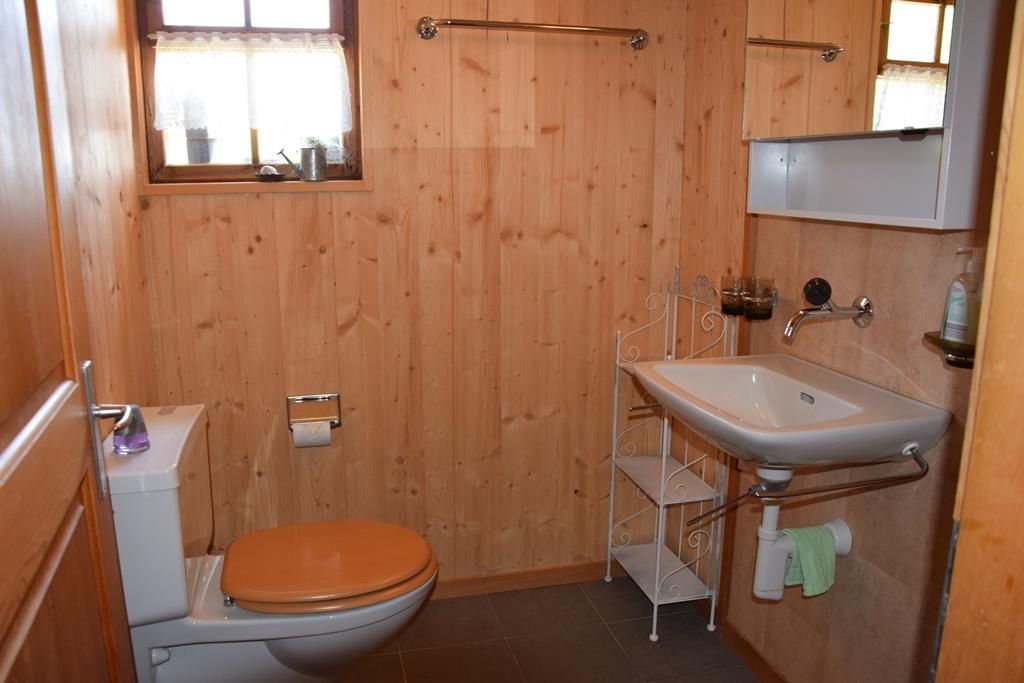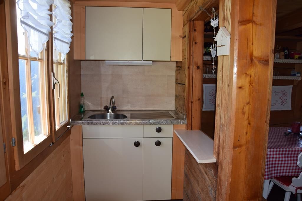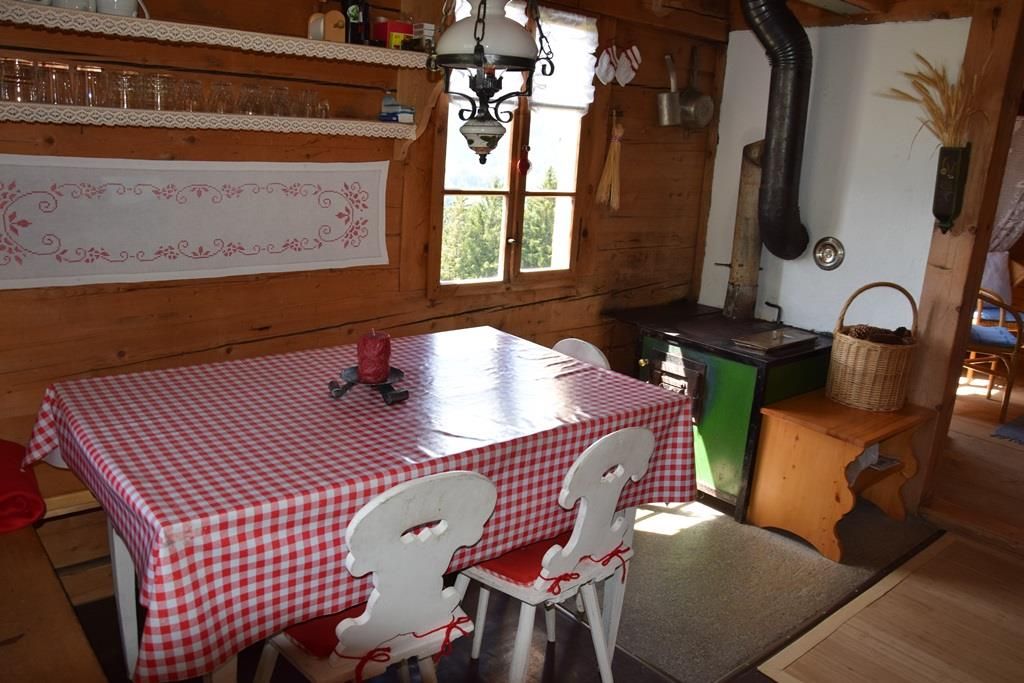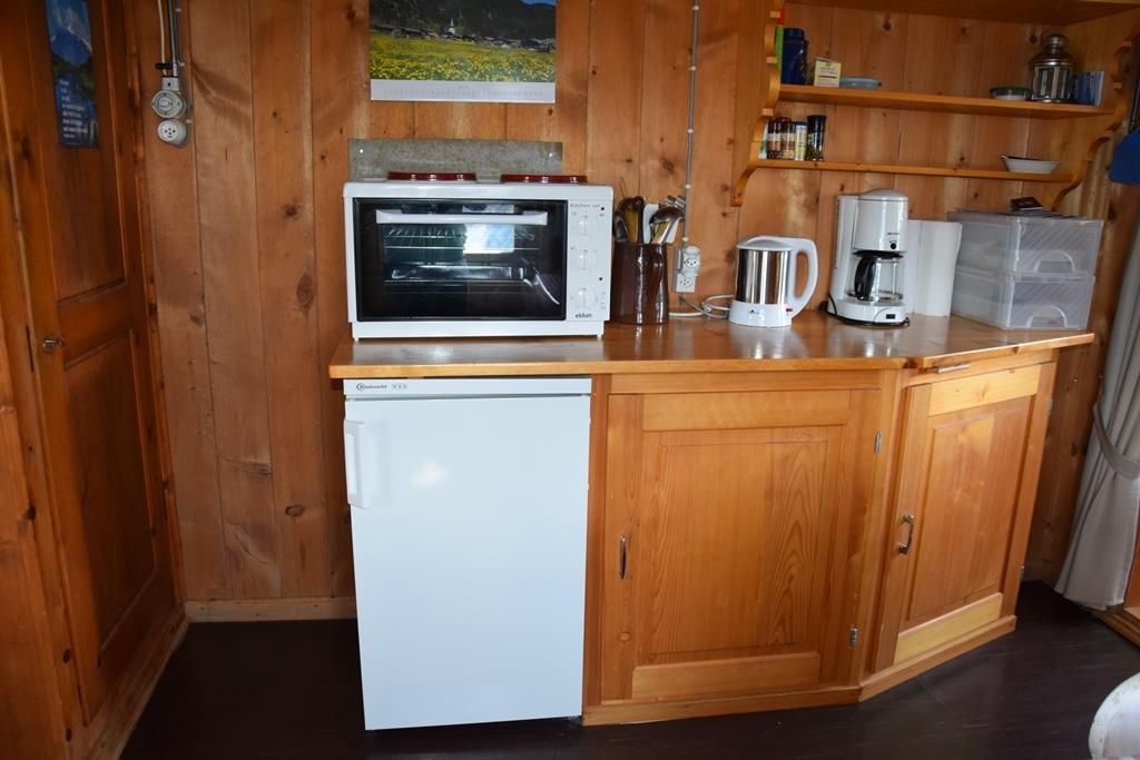 Gemütlich eingerichtete Alphütte mit offener Küche und separatem Lavabo, 1 kleiner Backofen mit zwei Herdplatten, Esstisch, 1 Ofen zum Heizen mit Holz, Sitzofen und Wohnzimmer mit Sofa. Im ehemaligen Stall befindet sich ein neuerbautes Badezimmer mit WC / Lavabo und im oberen Stock sind zwei Schlafzimmer (1x mit Franz. Bett und 1x mit drei Matratzen, analog Massenlager).