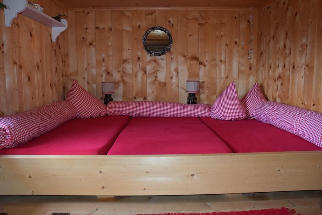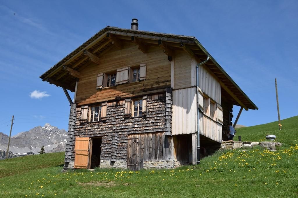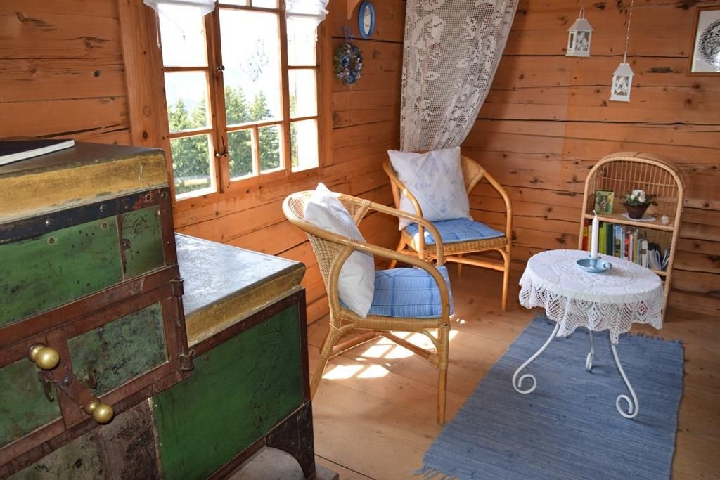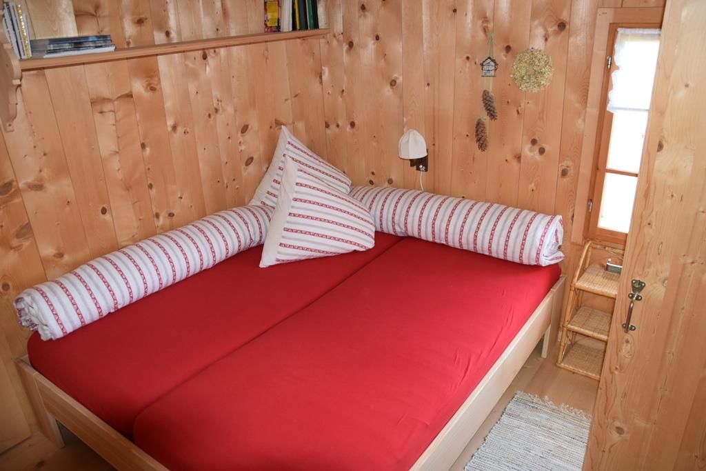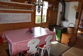 Gemütlich eingerichtete Alphütte mit offener Küche und separatem Lavabo, 1 kleiner Backofen mit zwei Herdplatten, Esstisch, 1 Ofen zum Heizen mit Holz, Sitzofen und Wohnzimmer mit Sofa. Im ehemaligen Stall befindet sich ein neuerbautes Badezimmer mit WC / Lavabo und im oberen Stock sind zwei Schlafzimmer (1x mit Franz. Bett und 1x mit drei Matratzen, analog Massenlager).