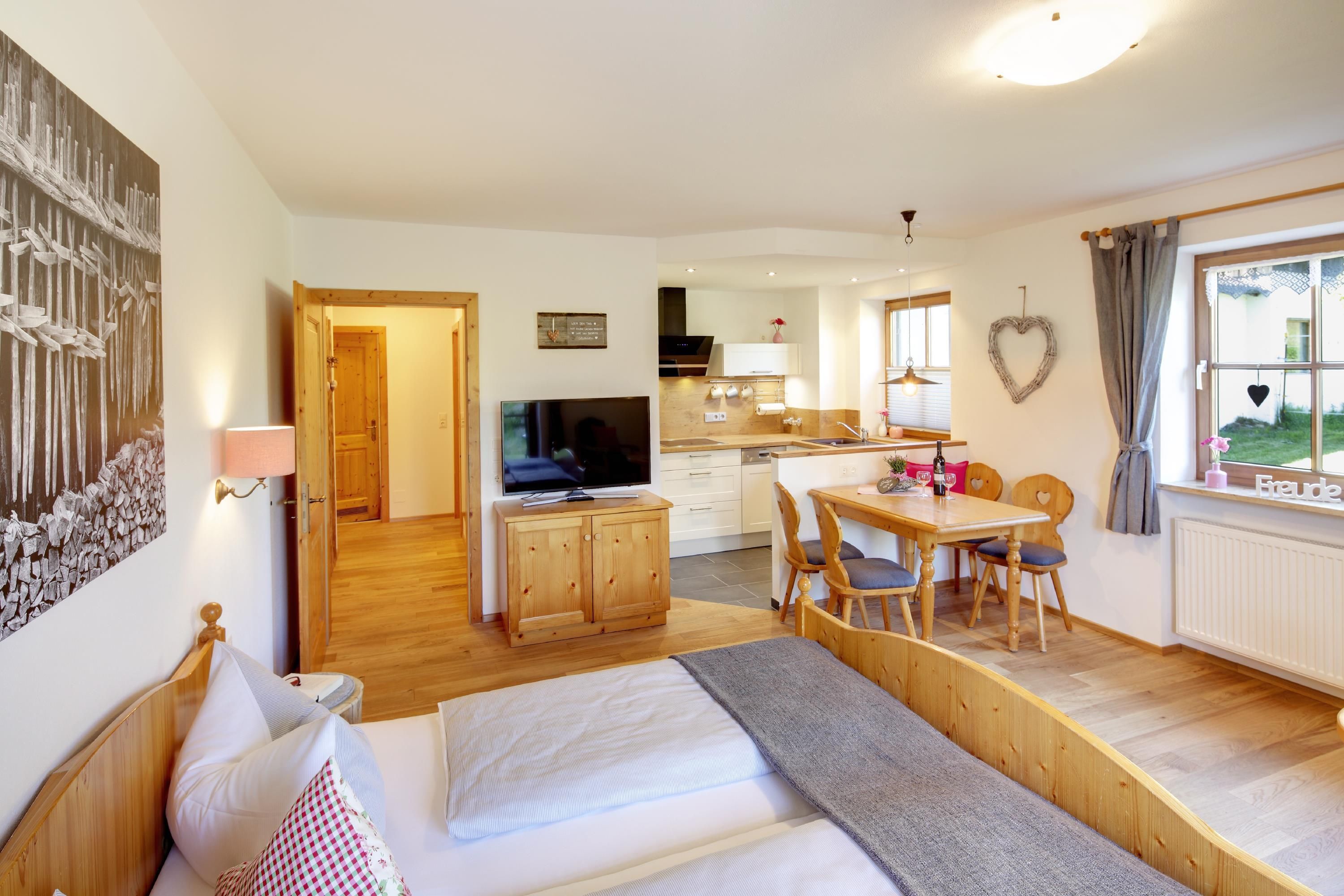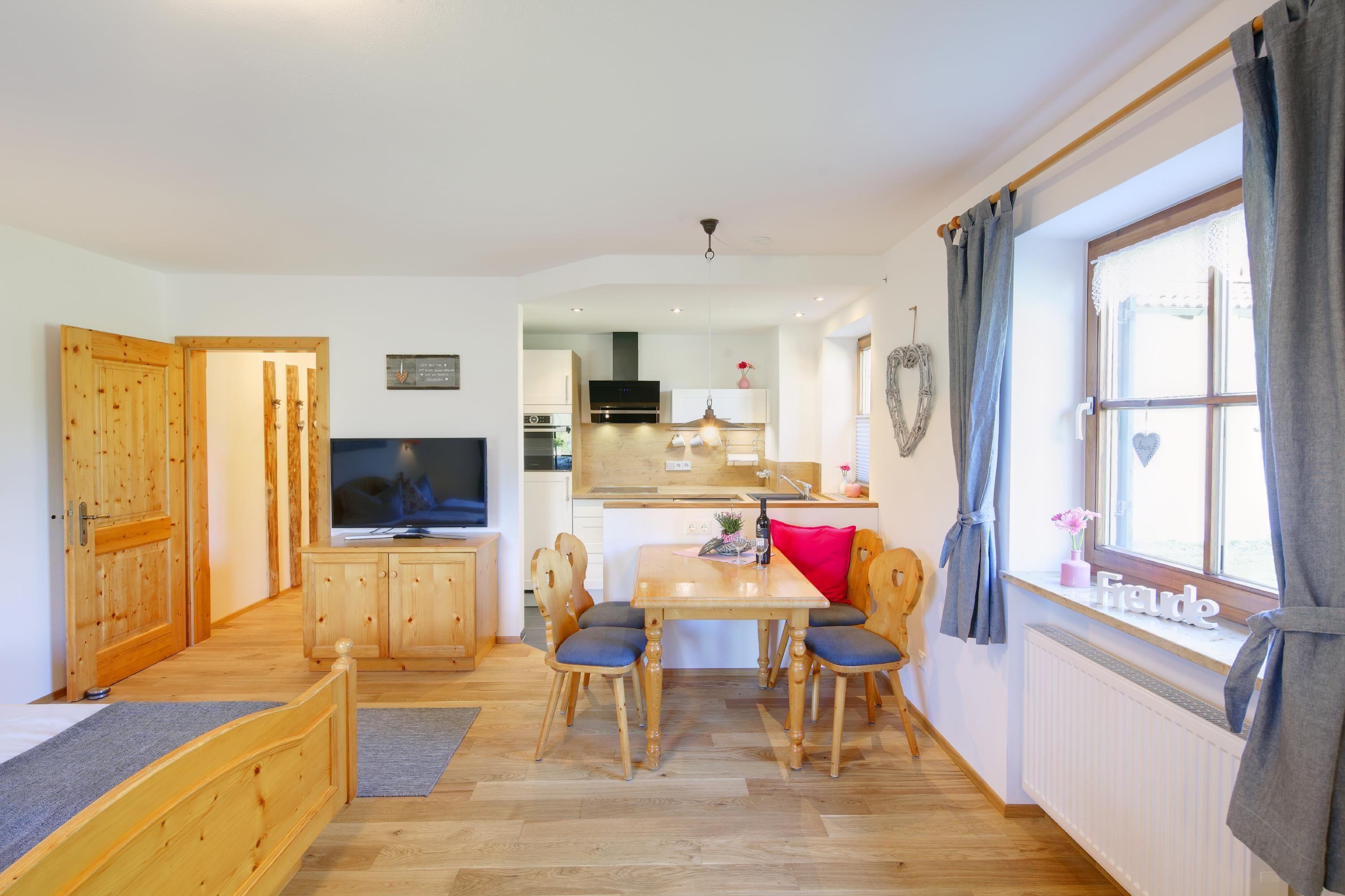 Nach der Übernahme des Popplerhofs im Jahre 2017 wurden alle 8 Ferienwohnungen im alpenländischen Stil mit moderner Einrichtung und Massiv-Holz-Böden renoviert. Hier finden Sie Behaglichkeit mit gut ausgestatteten Küchen, gemütlichen Essplätzen, bequemen Betten und eindrucksvollen Schwarz-Weiß-Bildern, die die Allgäuer Kulturlandschaft zeigen. 43 Zoll Flachbildschirme mit SAT-TV und kostenloses WLAN sind inklusive. Alle Wohnungen sind mit einem Balkon oder einer Terrasse ausgestattet und bieten einen Blick auf die umliegenden Allgäuer Berge und das Ammergebirge, nach denen die jeweiligen Wohnungen benannt sind. Werfen Sie einen Blick aus dem Fenster, dann finden Sie auch Ihren Berg.