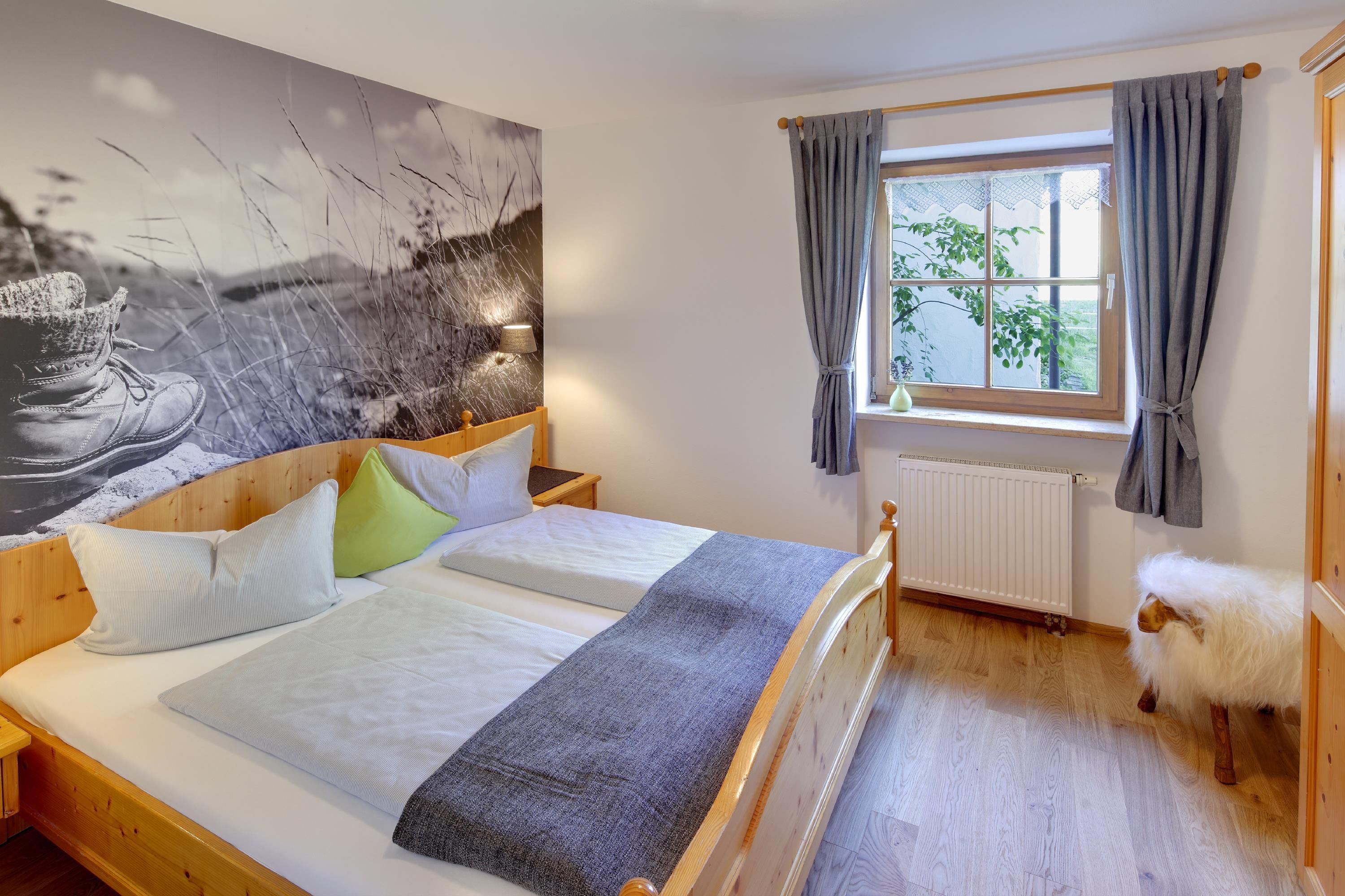 Unsere herrliche Ferienwohnung Grubenkopf ist mit einer Größe von 52 m² für 2-4 Personen geeignet. Die Wohnung liegt im Erdgeschoss und ist mit einem Wohn-/Schlafraum, separatem Schlafzimmer, offener Küche, Essplatz mit 4 Sitzplätzen und einem hellgefließten Bad ausgestattet. Die Wohnung ist nach Südosten ausgerichtet und besitzt eine schöne Süd-Ost-Terrasse und einem angrenzenden separaten kleinen Garten hinter dem Haus. Im lichtdurchfluteten Wohn-/Schlafraum haben Sie den ganzen Tag einen herrlichen Blick durch die Fensterfront in die angrenzende Natur und die Allgäuer Berge. Hier erwartet Sie ein Doppelbett und eine gemütliche Sitzecke mit zwei Stühlen und Tischchen. Das separate Schlafzimmer ist ebenfalls mit einem Doppelbett ausgestattet. Die großen Schränke bieten viel Platz für Ihre Utensilien. Ganz herrlich ist das Motiv mit dem großen Wanderstiefel. Im Wohnraum befindet sich ein Flachbildschirm (43 Zoll) mit SAT/TV und kostenfreiem WLAN. Die moderne offene Küche ist mit Spülmaschine, Kühlschrank mit Gefrierfach, 4 Platten-Cerankochfeld mit Backofen, Kaffeemaschine, Wasserkocher und Toaster. Vor der Küche befindet sich ein Sitzgarnitur mit Platz für 4 Personen. Direkt vom Flur mit Garderobe und großem Spiegel haben Sie einen Zugang zum Bad mit Dusche, WC, Waschbecken und Heizung mit Handtuchwärmer. Vom Wohnraum betreten Sie Ihre 10 m² große Terrasse mit angrenzender Wiese. Und diese Wohnung hat noch ein verstecktes Highlight: Angrenzend zur Terrasse befindet sich noch ein kleiner Wiesengarten hinter dem Haus. Hier können Sie unbeschwert die Sonne genießen und auch in Ruhe ein Buch lesen oder die Pferde beobachten.