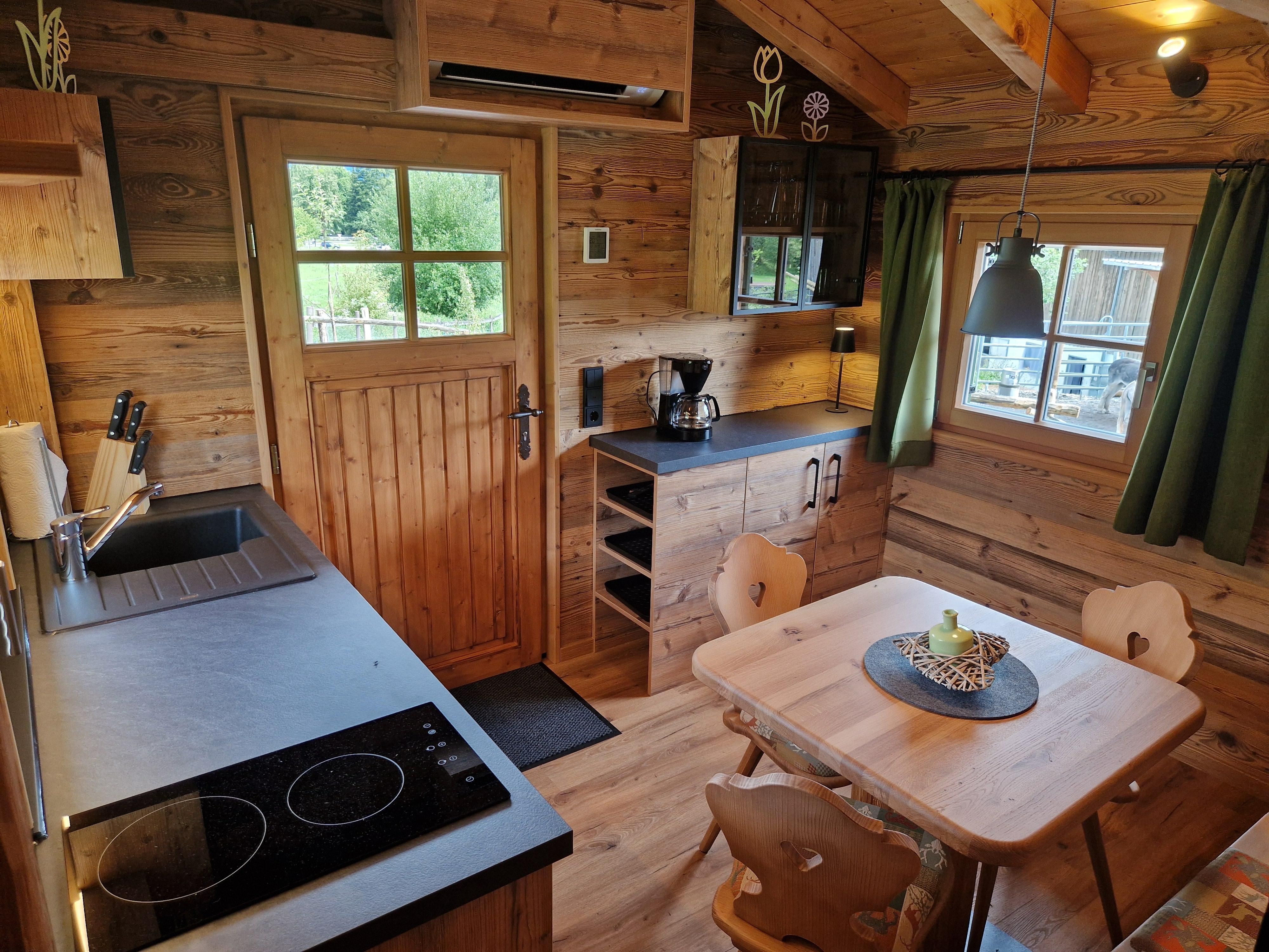 Die Küche ist ausgestattet mit einem 2-Platten-Ceranfeld, Kühlschrank mit Gefrierfach, Kaffeefiltermaschine, Wasserkocher, Toaster und allen notwendigen Küchenutensilien.