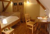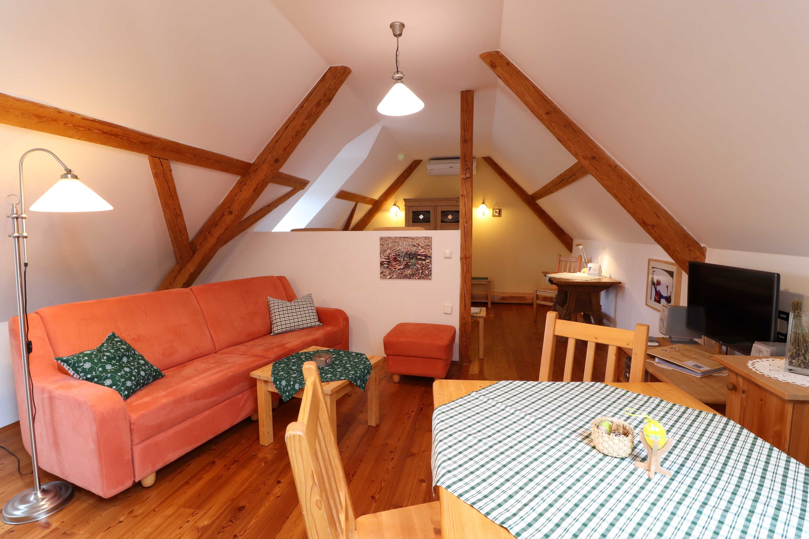 Unser romantischer Laubwald ist allergikerfreundlich und besteht aus einem Wohnraum mit zwei möglichen Zusatzbetten und einer Küche, der Schlafraum mit Doppelbett ist davon mit einer halbhohen Wand getrennt, weiters gibt es das Badezimmer mit Dusche und WC.