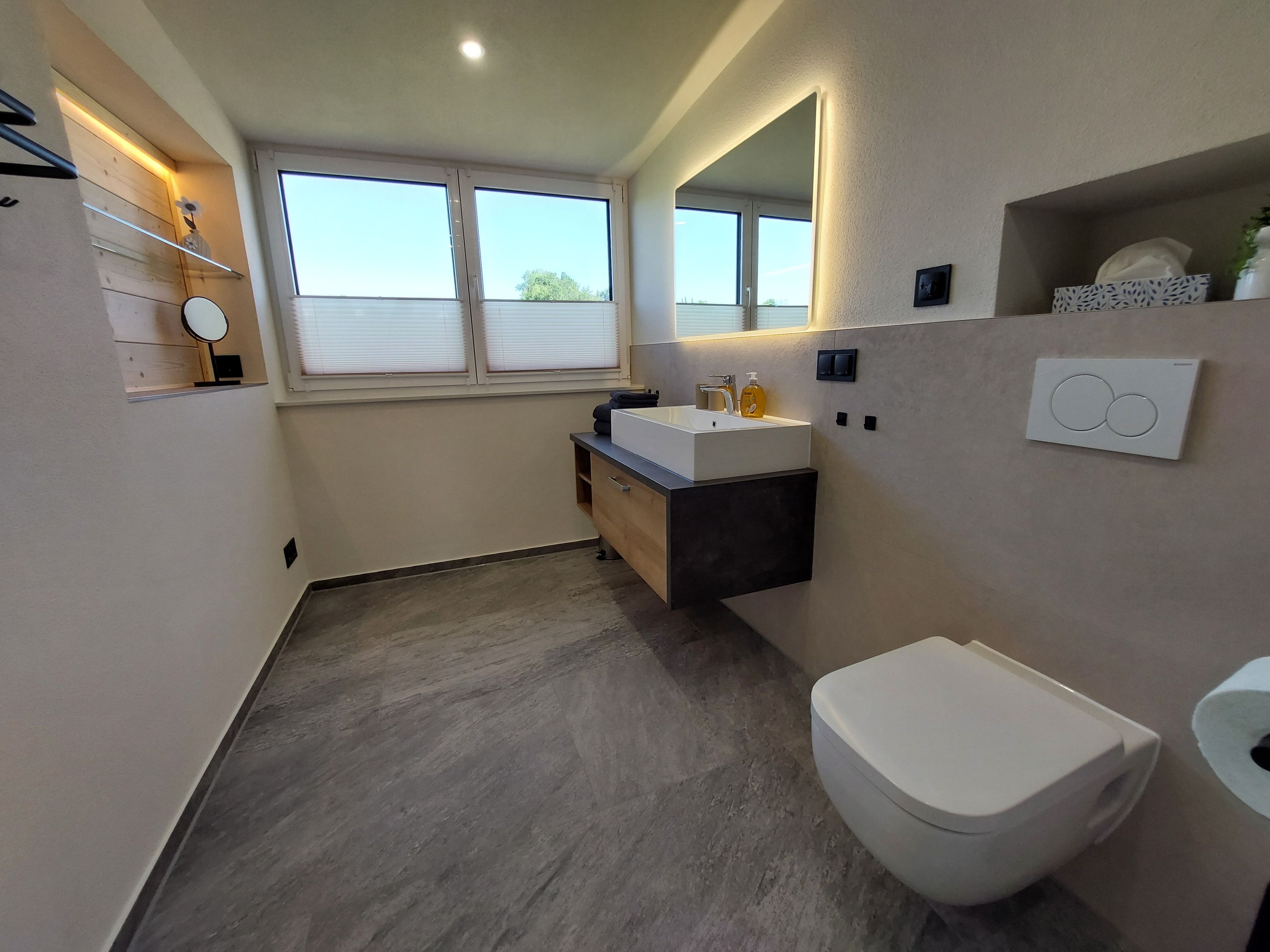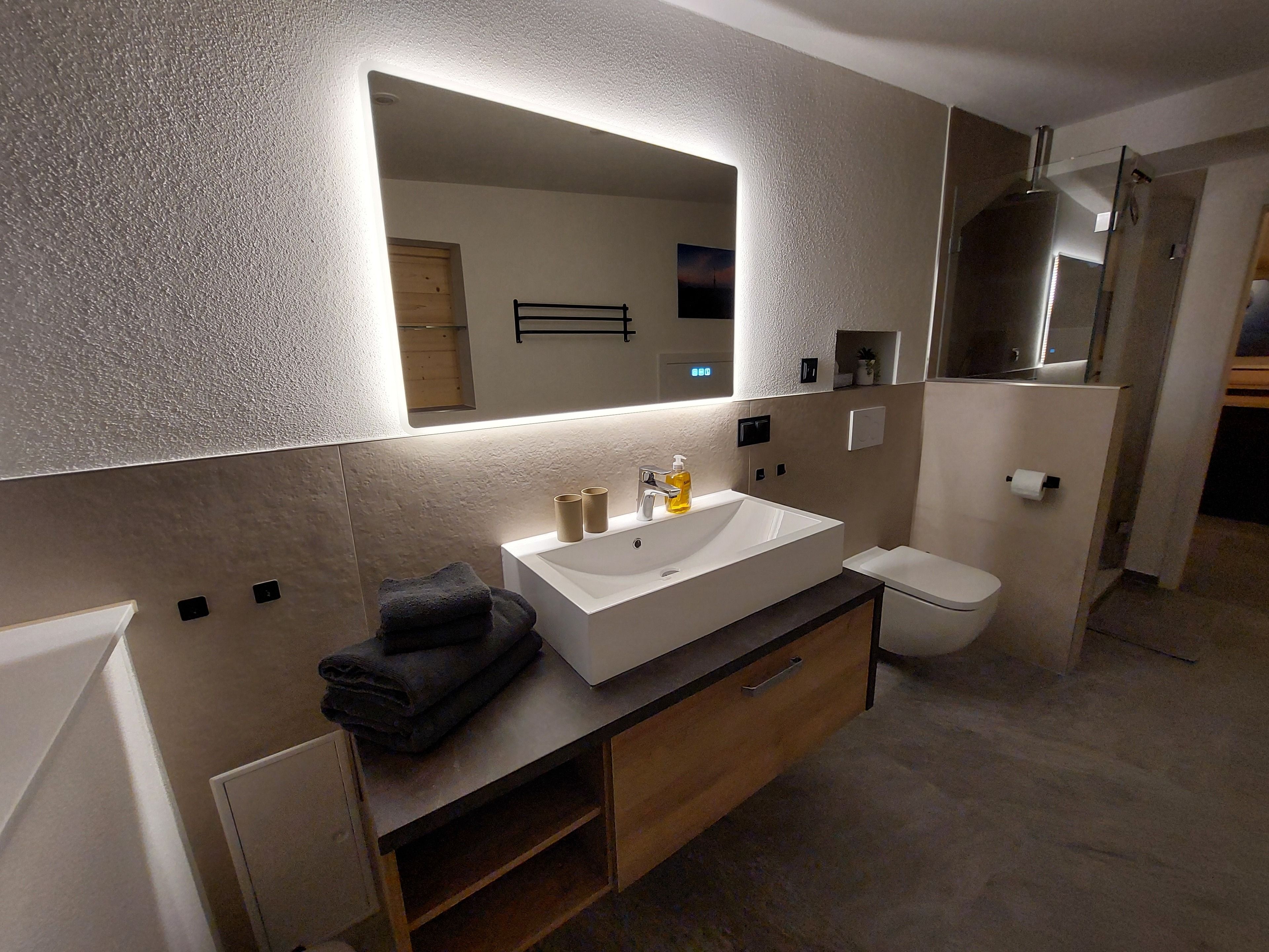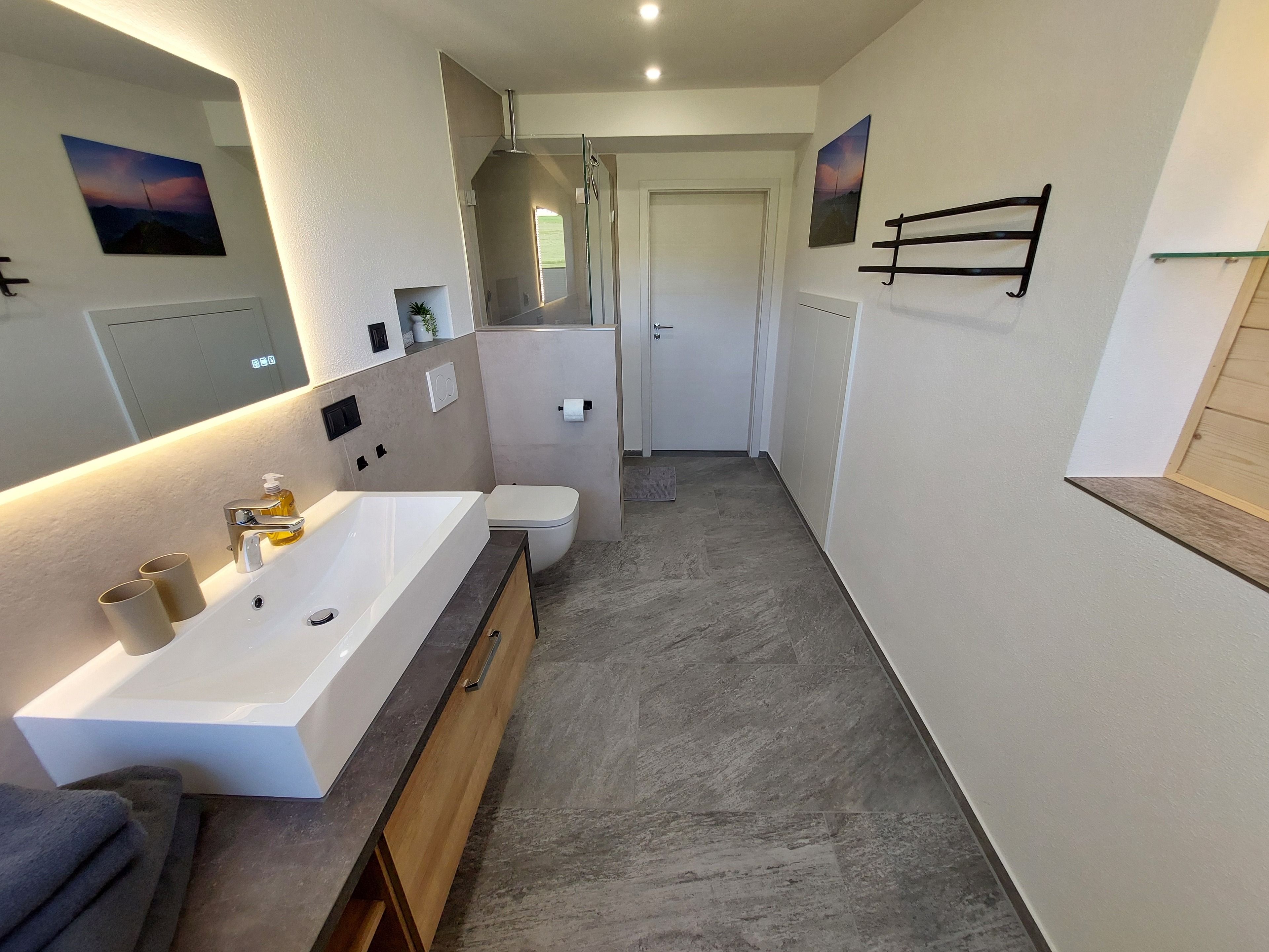Bad mit großer Regenwalddusche, Toilette, Waschbecken und reichlich Abstellmöglichkeiten