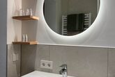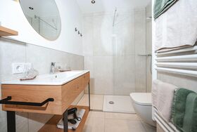 Das Zimmer ist mit einem großes Doppelbett, Schreibtisch, Flat-TV, Dusche, WC, Handtüchertrockner, W-Lan, Föhn und Badeartikel ausgestattet.