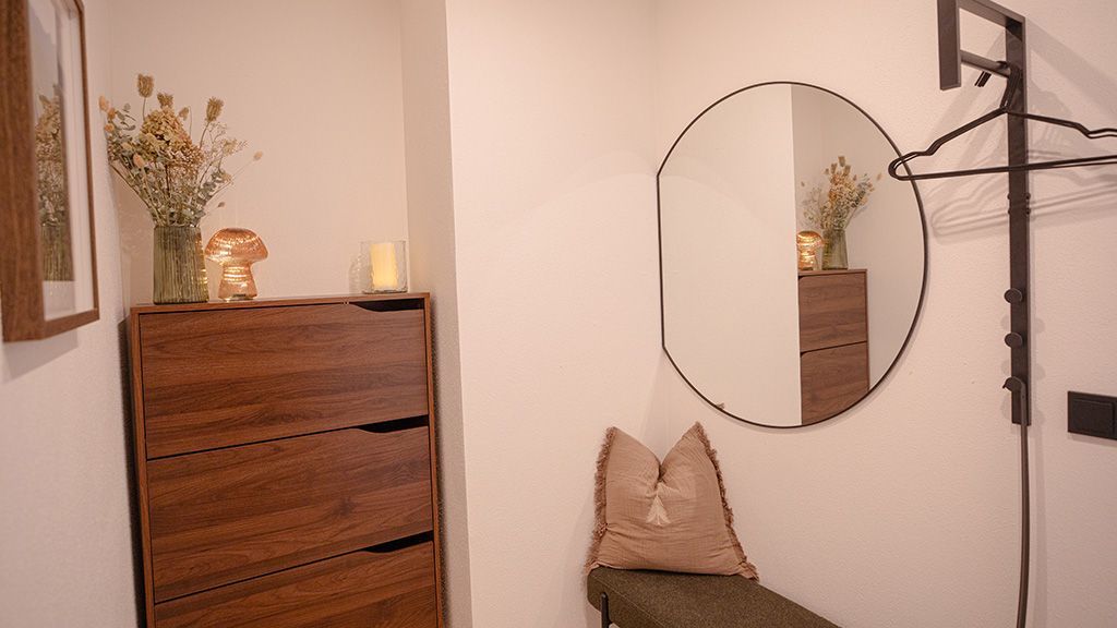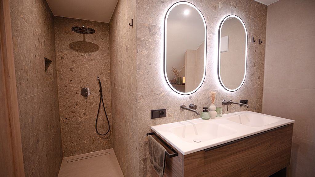 Die Ferienwohnung Rosi überzeugt mit einem offenen, einladenden Ambiente und viel Liebe zum Detail ideal für alle, die stilvolles Wohnen mit Gemütlichkeit verbinden möchten. Ein großzügiger Vorraum heißt Sie herzlich willkommen und bietet praktischen Stauraum. Die Wohnküche ist voll ausgestattet und lädt mit einer komfortablen Schlafcouch zum gemeinsamen Kochen, Essen und Entspannen ein. Im geräumigen Schlafzimmer erwarten Sie ein gemütliches Doppelbett, ein praktischer Kleiderschrank sowie ein Smart-TV - perfekt für ruhige Nächte und entspannte Morgenstunden. Das Badezimmer ist ein echtes Highlight: eine großzügige Regendusche, eine große Badewanne, ein Doppelwaschbecken mit Unterschrank, ein WC und ein praktischer Handtuchtrockner sorgen für höchsten Komfort und Wohlbefinden. Vom möblierten Balkon inklusive Loungesessel genießen Sie den Blick ins Grüne und die ersten Sonnenstrahlen bei einer Tasse Kaffee. In der Wohnung Rosi ist das Rauchen nicht gestattet. Kostenloses WLAN steht Ihnen auf dem gesamten Hof zur Verfügung. Die Wohnung liegt im zweiten Stock des charmanten Hofgebäudes und ist über die Außentreppe erreichbar.