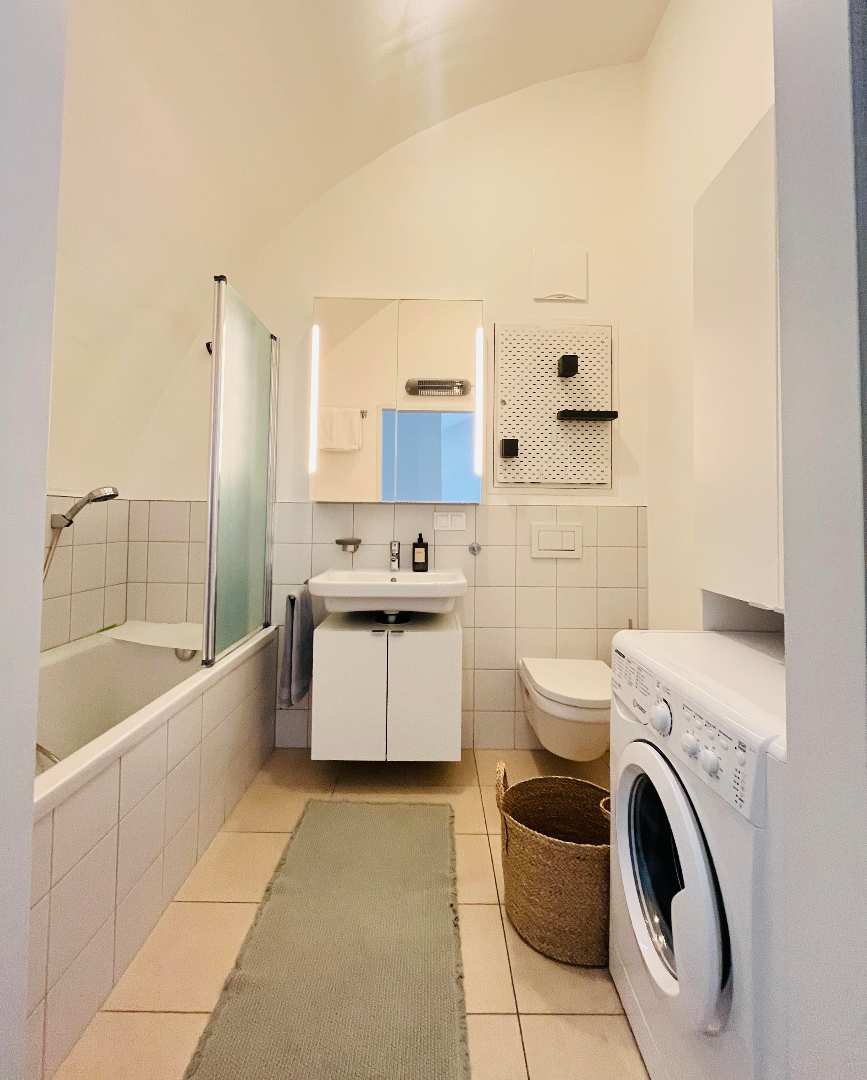 • 1 Badezimmer mit Badewanne/Dusche, Waschbecken, WC und Waschmaschine,