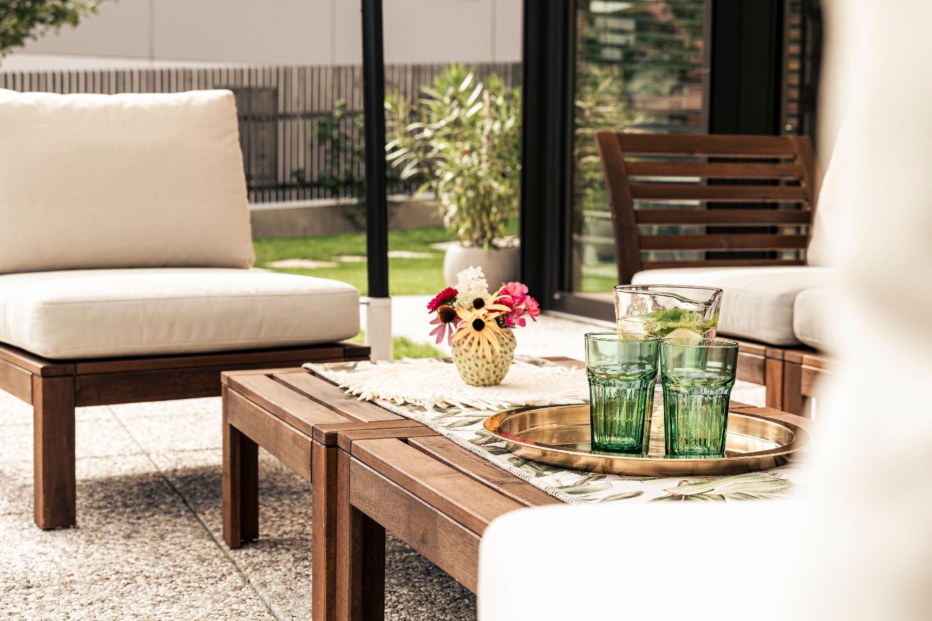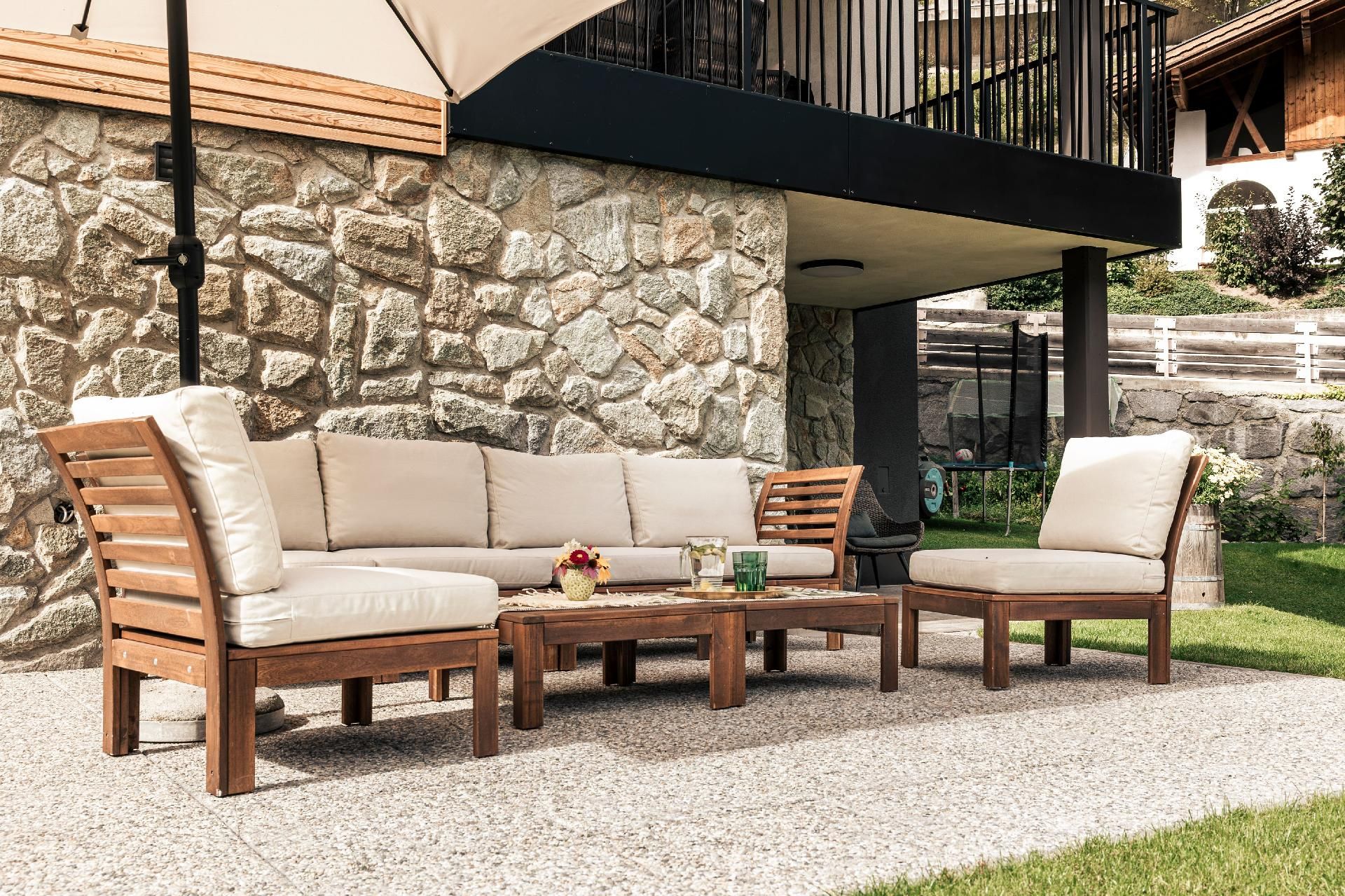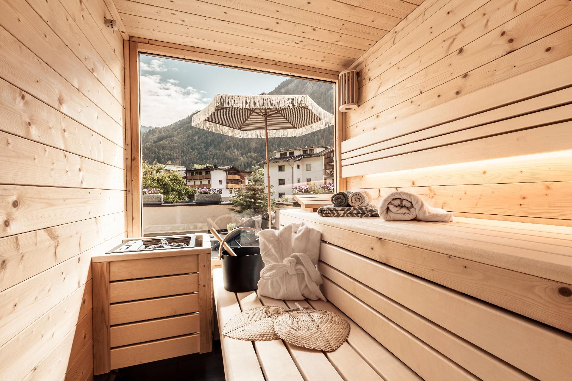 Zwei Terrassen - eine überdacht mit Essbereich & Grill, die andere mit Sonnenliegen & privater Außensauna - laden zum Entspannen ein.