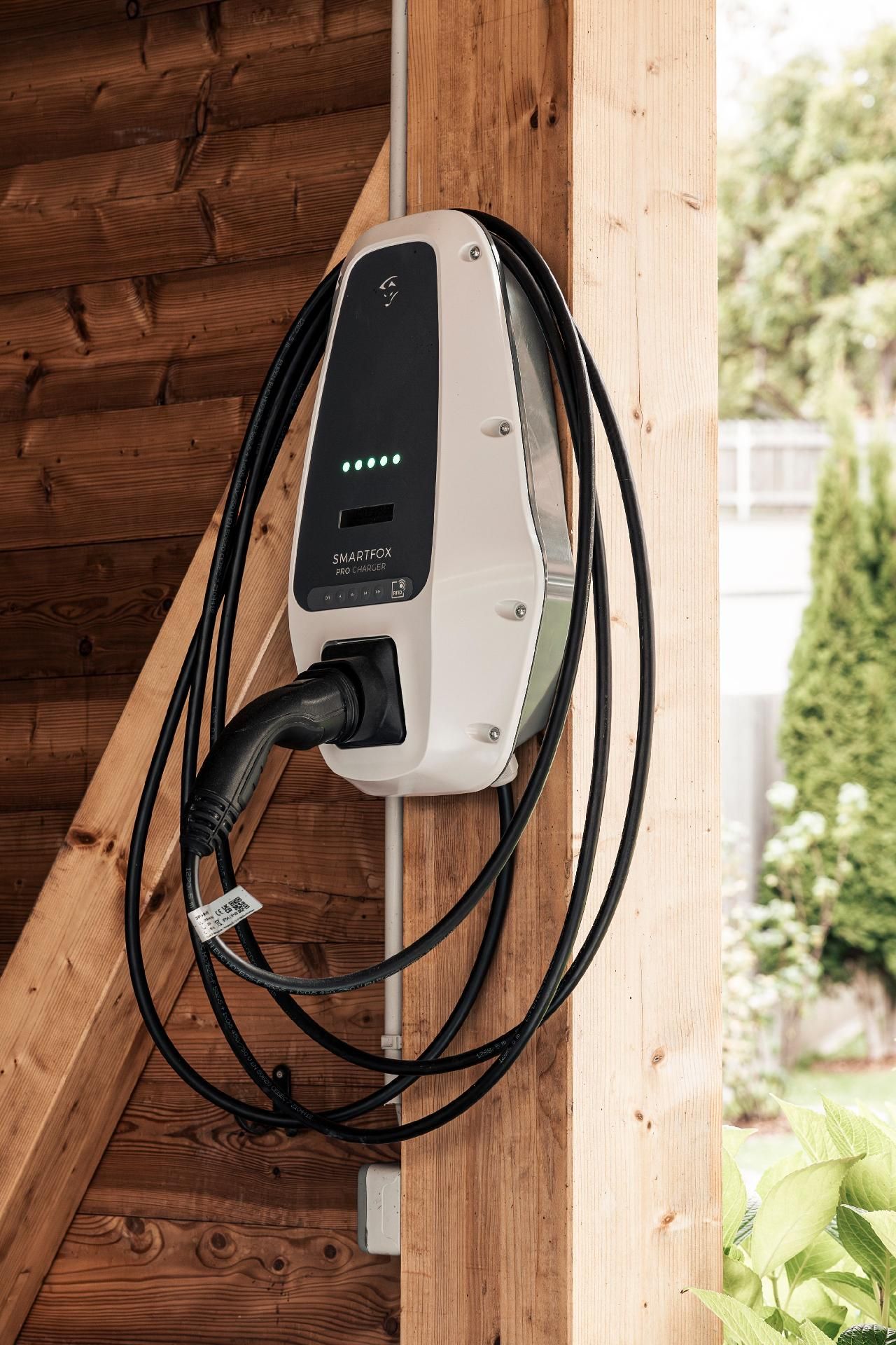 Zwei überdachte Parkplätze (Carport) sowie eine Ladestation für E - Autos stehen für sie bereit.
