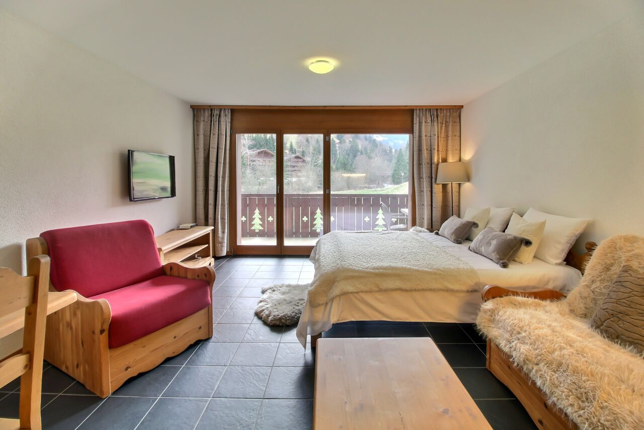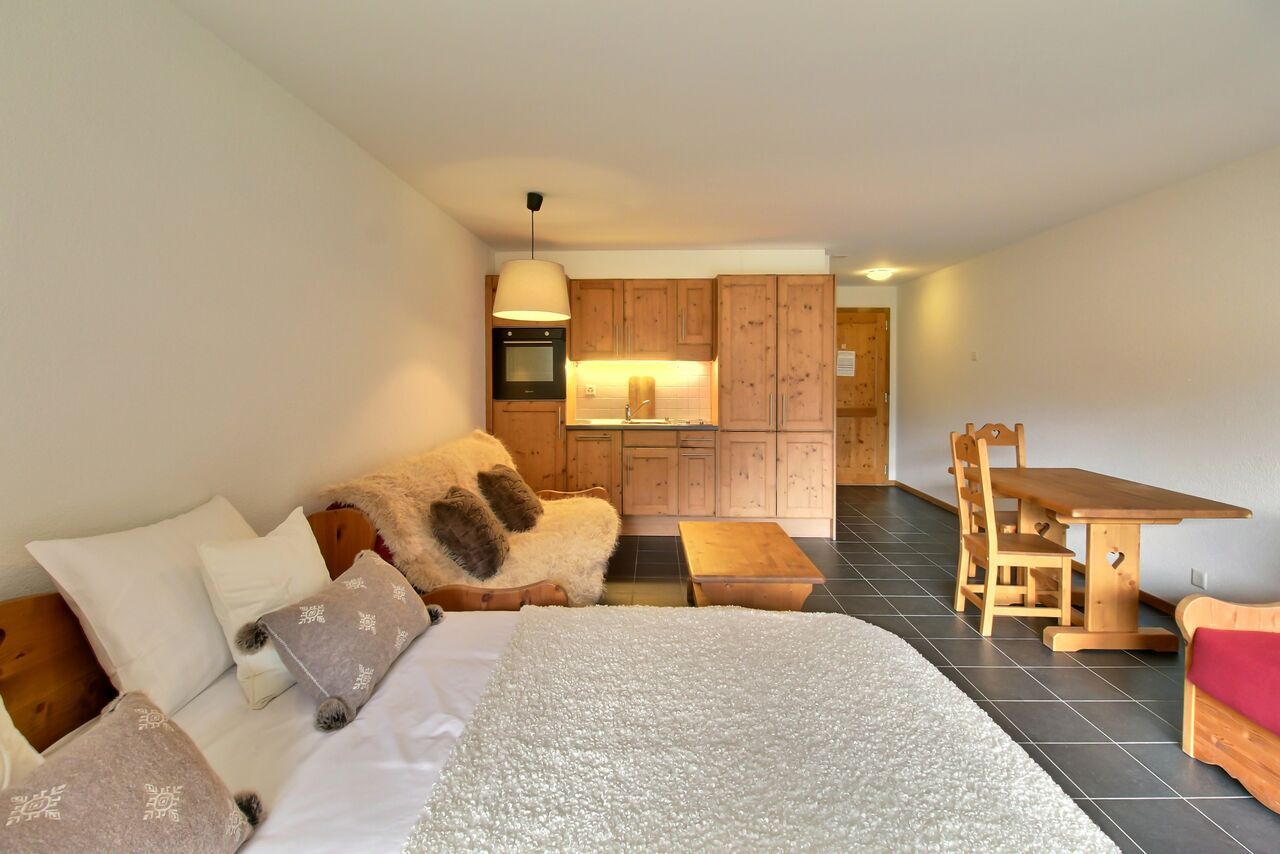 45 m² großes Studio (mit 5 m² großem Balkon) mit: Eingang, Wohn-/Esszimmer, Schlafsofa, 1 Relaxsessel, Esstisch mit 4 Stühlen.Offene, ausgestattete Küche mit 2 Kochplatten, Backofen, Kühlschrank, Kaffeemaschine, Fondue-Caquelon und Raclette-Gerät, Toaster, Wasserkocher.