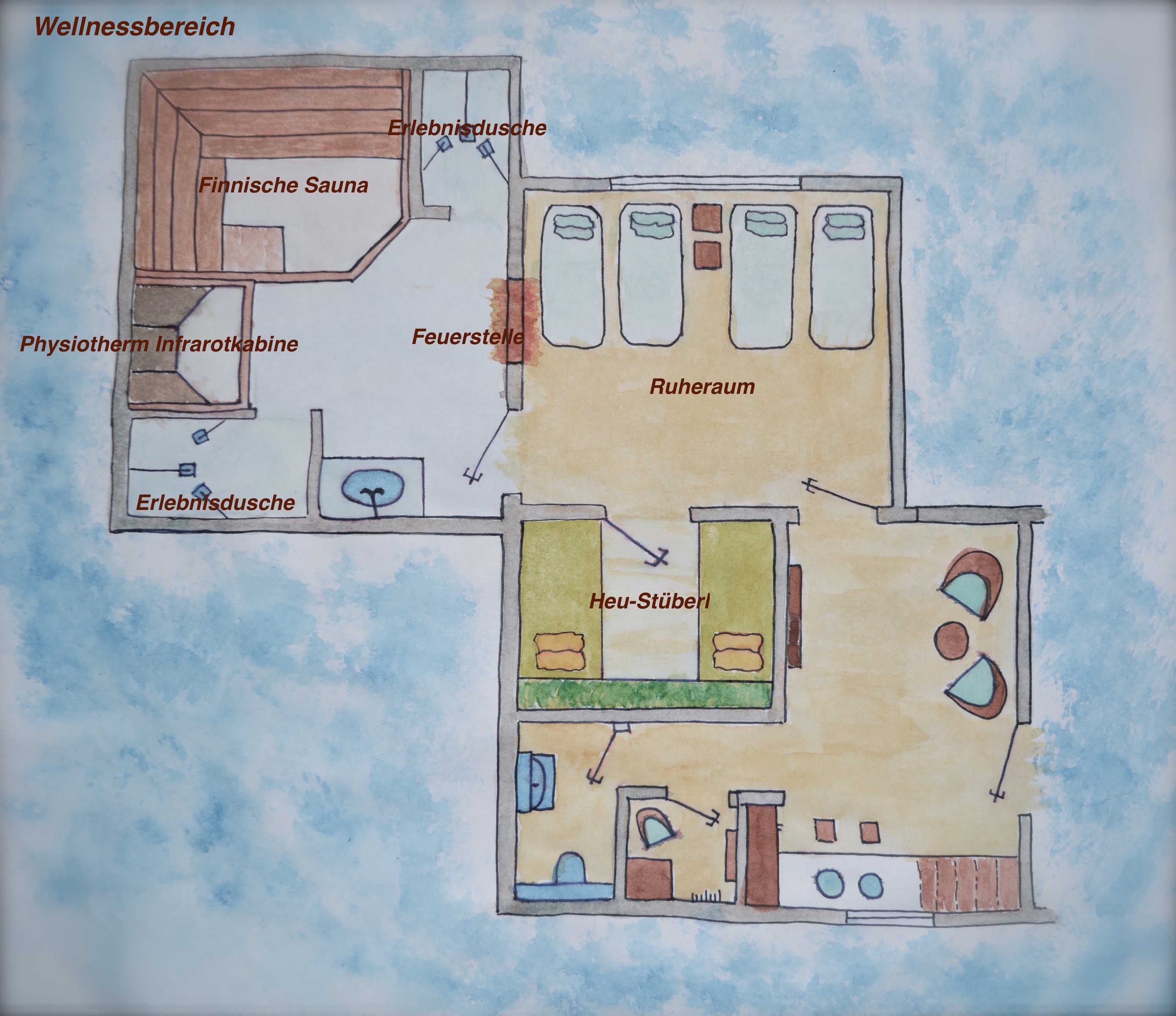 Zurück in Ihrer Ferienwohnung wartet unser hauseigener Wellnessbereich auf Sie. Tanken Sie frische Energie in unserer finnischen Sauna, der Infrarot-Wärmekabine und in unserem Alm-Traum-Raum.