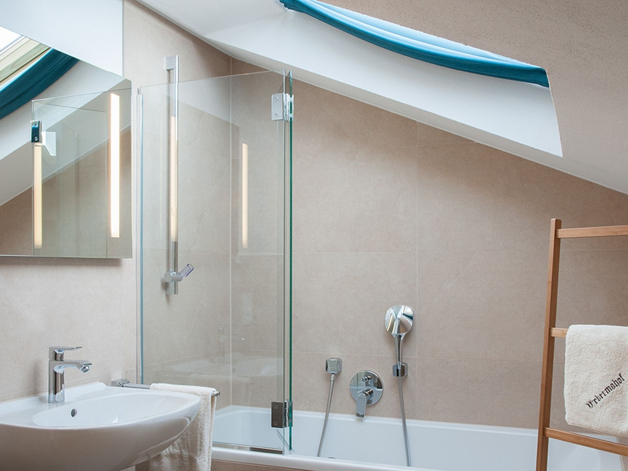 • Bad mit Wohlfühldusche und Badewanne, WC und Föhn