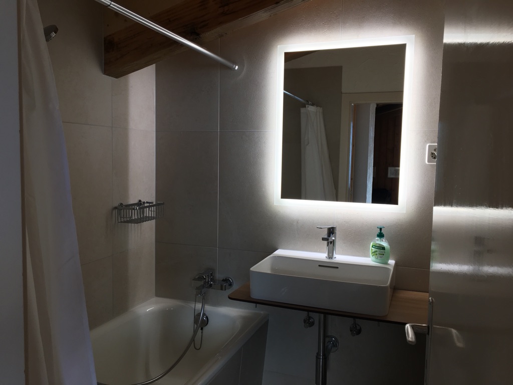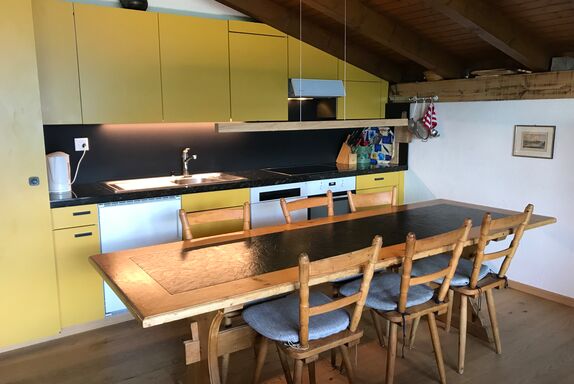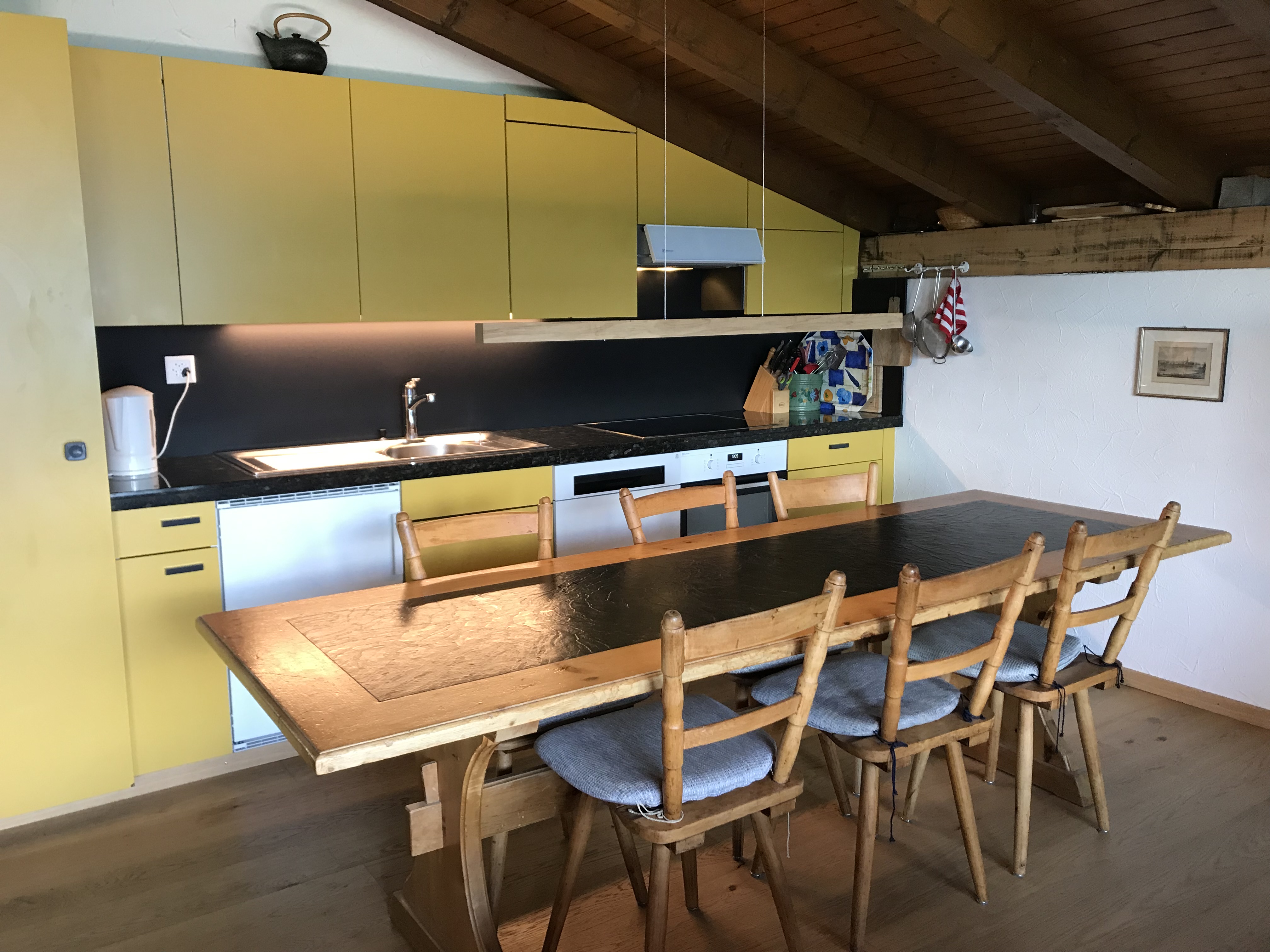 Die Küche ist komplett und großzügig ausgestattet. Sie verfügt über einen elektrischen Herd mit 4 Kochplatten, Backofen, Spülmaschine, Kaffeemaschinen (Filterkaffee, Machinetta in 2 Größen), Toaster, Handrührgerät, Zauberstab, Racletteofen, Fondue-Gaglon. Hand- und Maschinen-Spülmittel sowie Schwämme sind vorhanden.