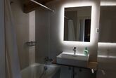 Das Badezimmer ist klein, aber funktional mit Dusch-Badewanne und Waschbecken. Es gibt eine separate Toilette.