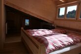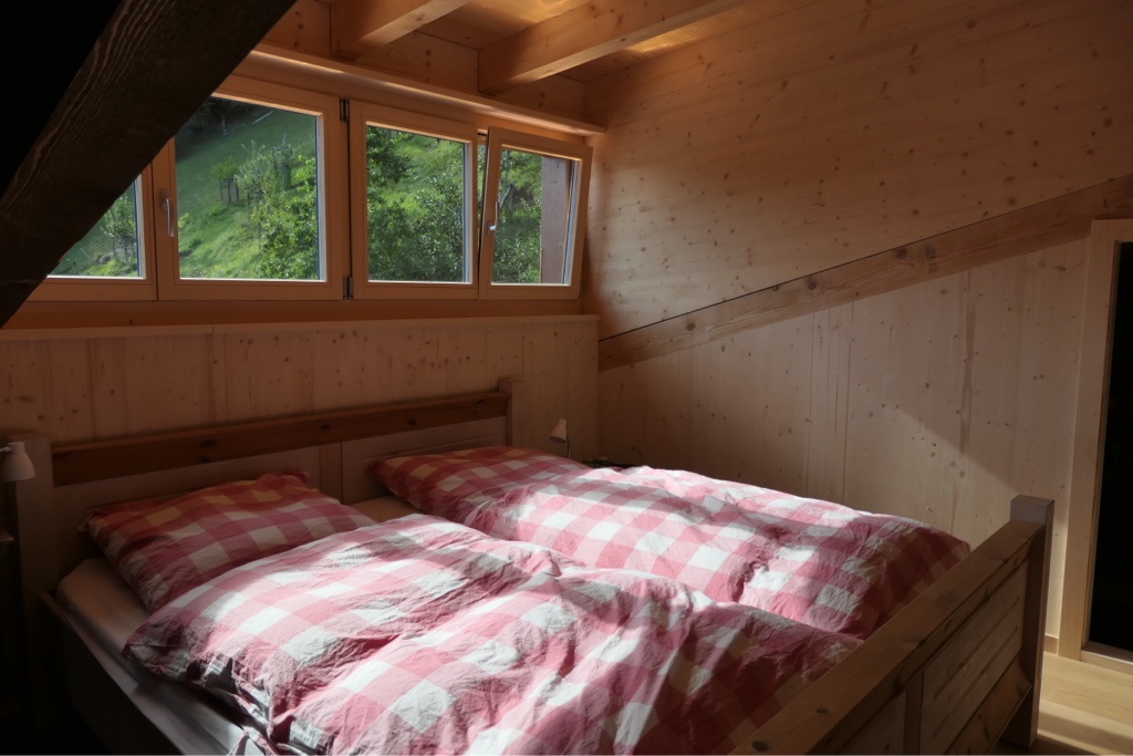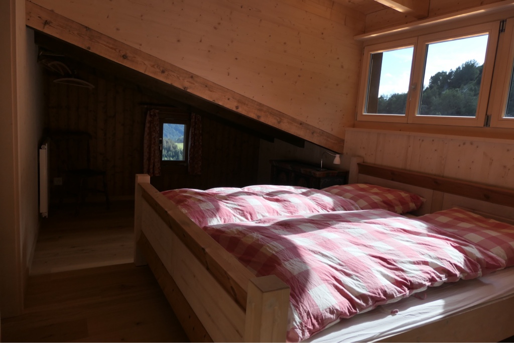 Beidseits ans WZ angrenzend befinden sich die 2 Schlafräume unter Dachschrägen. Der kleine Schlafraum mit einem 2m Doppelbett ist mit einer Gaube ausgestattet, welche begrenzt Stehhöhe bietet. Der größere Schlafraum hat 1 Doppelbett und 2 Einzelbetten, welche als einfache, bodennahe Schlafkojen gestaltet sind. Aufrechtes Stehen in diesem Raum ist erschwert bei Dachschrägen und einer max Raumhöhe von 1,65. Auch die Tür zu diesem Zimmer ist niedrig, daher nicht geeignet für größere Menschen ! Aus den Schlafzimmerfenstern bietet sich ein aussichtsreicher Bergblick.