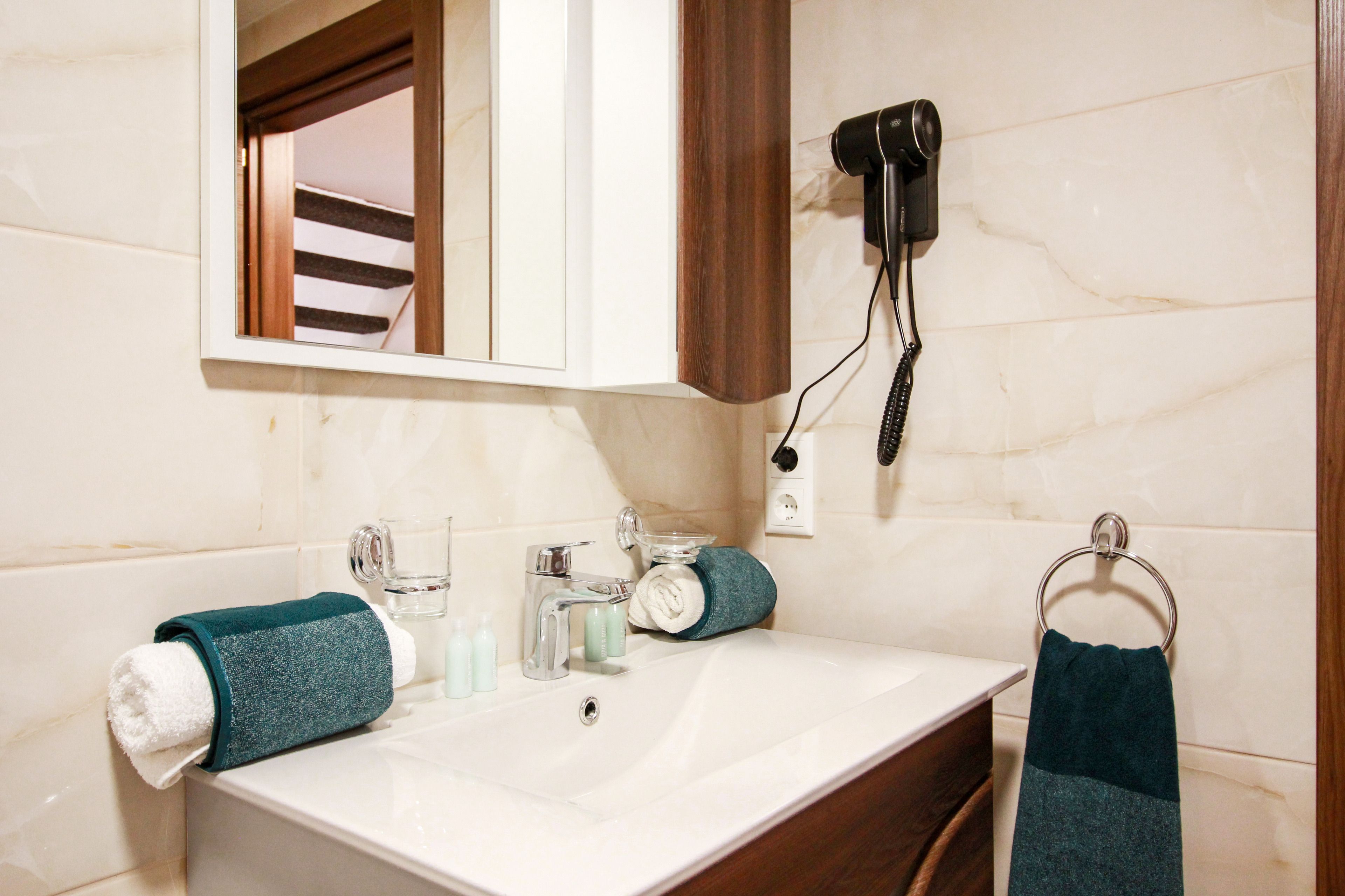 Haartrockner. Oben ein Schlafraum mit Doppelbett mit extra hoher Matratze und Topper für