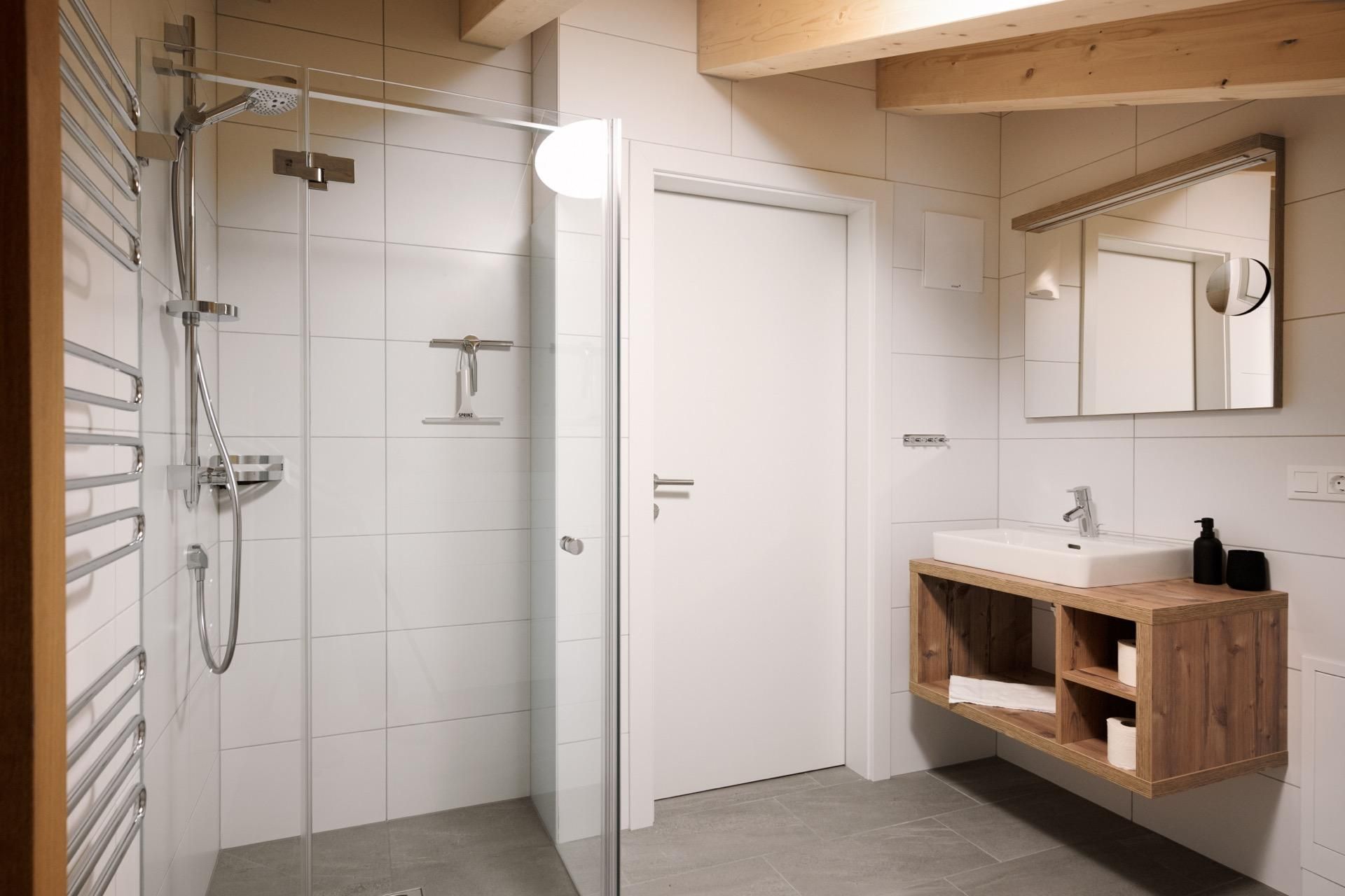 • Badezimmer mit Dusche und WC, beheizter Handtuchhalter