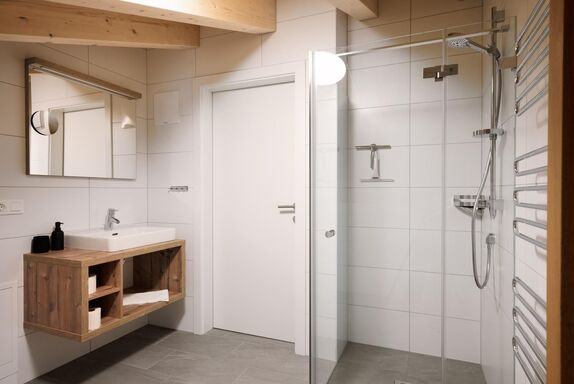 • Badezimmer mit Regendusche und WC, beheizter Handtuchhalter