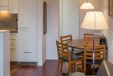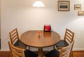 Im geräumigen Wohn-/Esszimmer befindet sich eine bequeme Ledercouch, die sich mit einfachem Handgriff zu einem Doppelbett umfunktionieren lässt. Der runde Esstisch ist an 4 Seiten ein/aufklappbar.