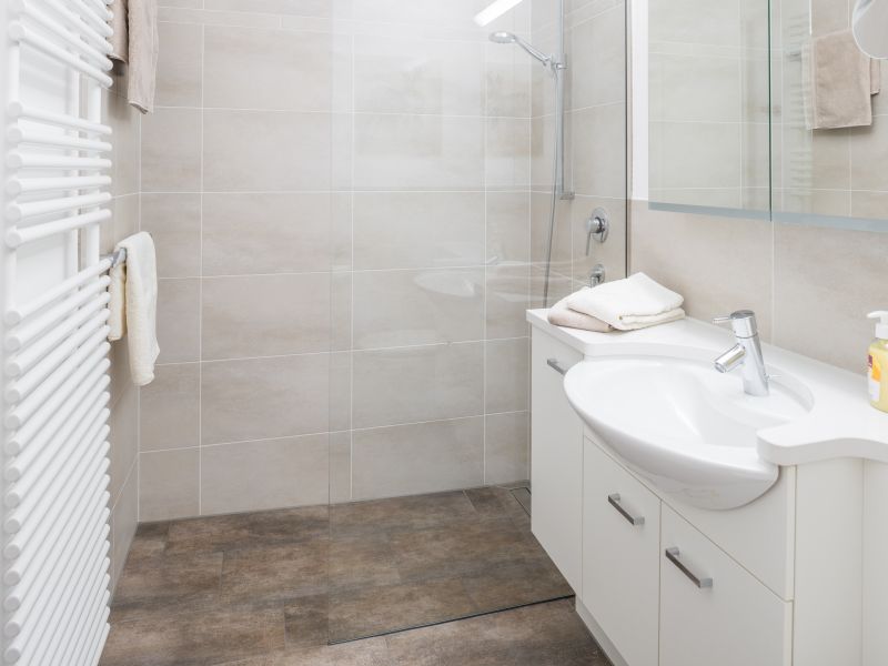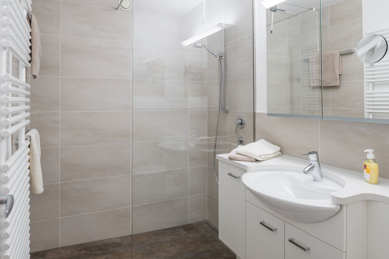Duschbad inkl. WC: Die Dusche ist ebenerdig angelegt und durch eine Glaswand abgetrennt. Sie finden genügend Platz für ihre Badutensilien in einem breiten Spiegel- und Waschbeckenunterschrank. Die Badheizung ist als Handtuchheizung ausgelegt. Ein Haarfön ist vorhanden.