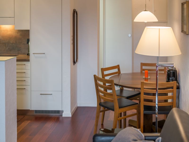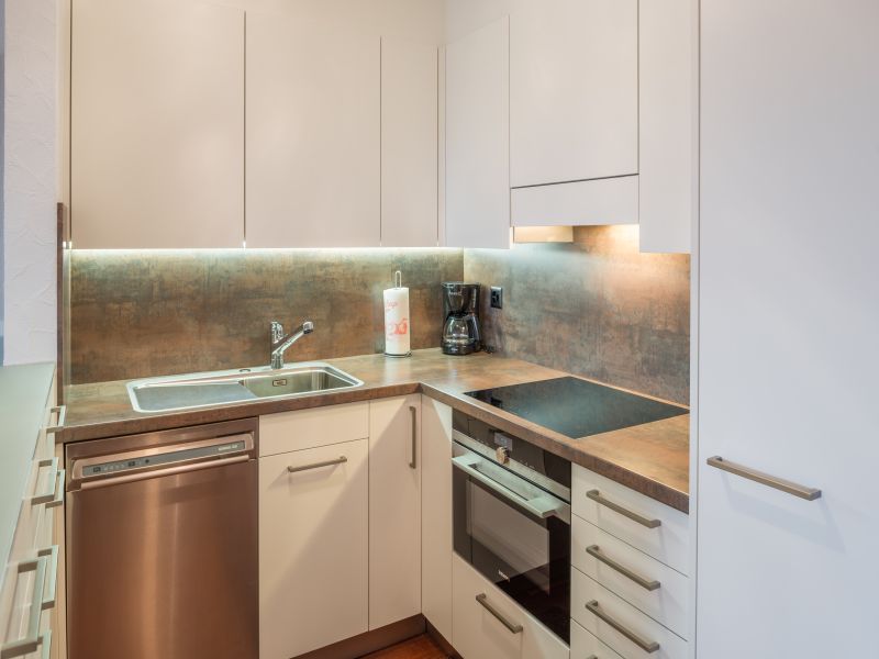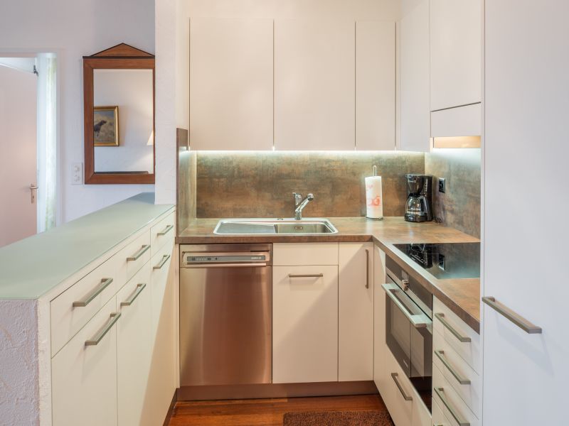 Die Wohnung hat eine offene Küche mit Geschirrspüler, Induktions - (Ceran-) Kochfeld, Backofen mit integrierter Mikrowelle, großer Kühlschrank mit Nullgrad- und Tiefgefrierfach, Kaffeemaschine und Wasserkocher sowie eine großzügige Ausstattung an Geschirr und Gläsern. Ein Raclette- und ein Fonduegerät sind vorhanden.