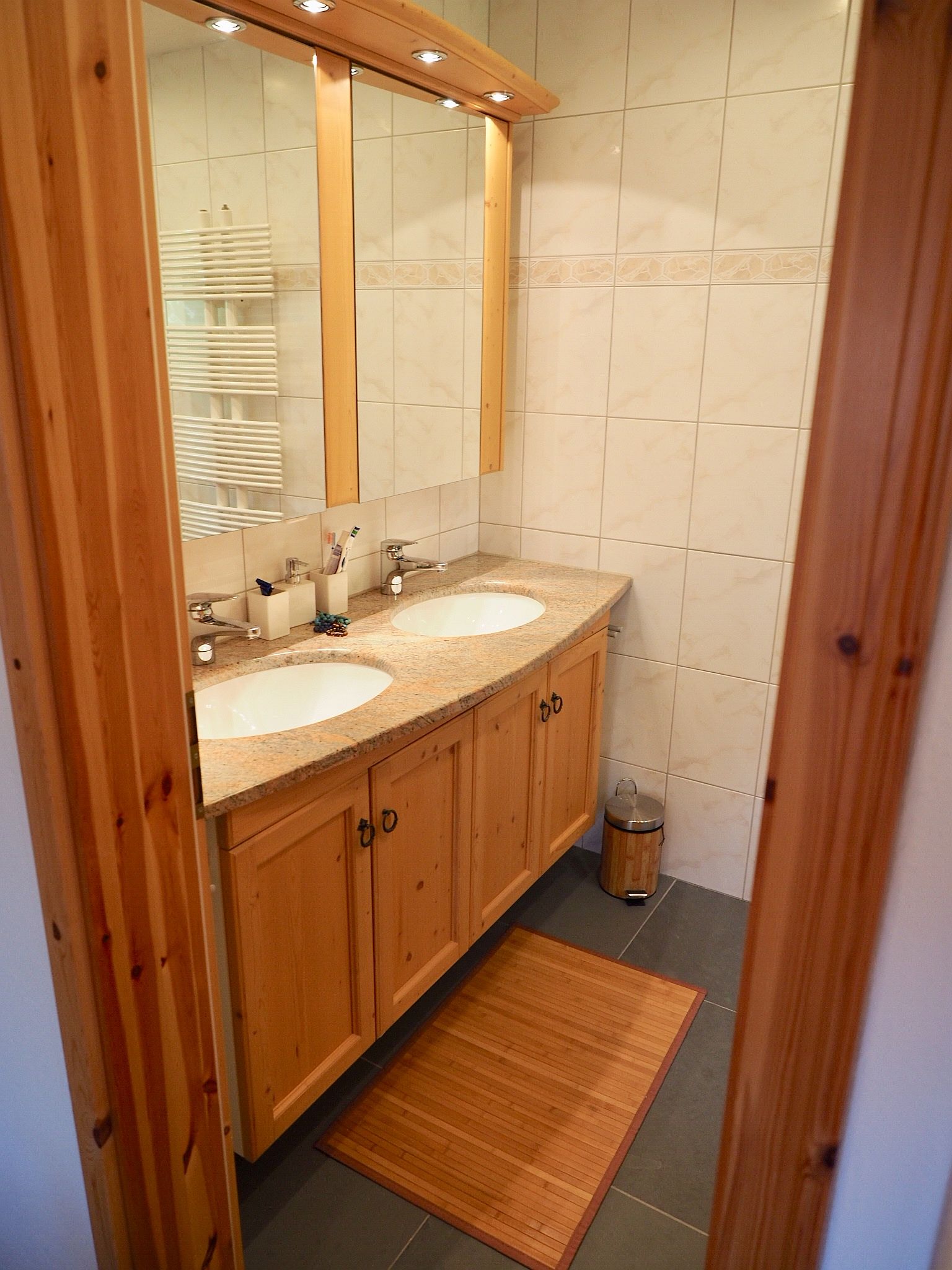 Badezimmer mit Fenster, Badewanne, WC, Spiegelschrank, Doppel-Waschbecken. Haartrockner vorhanden.