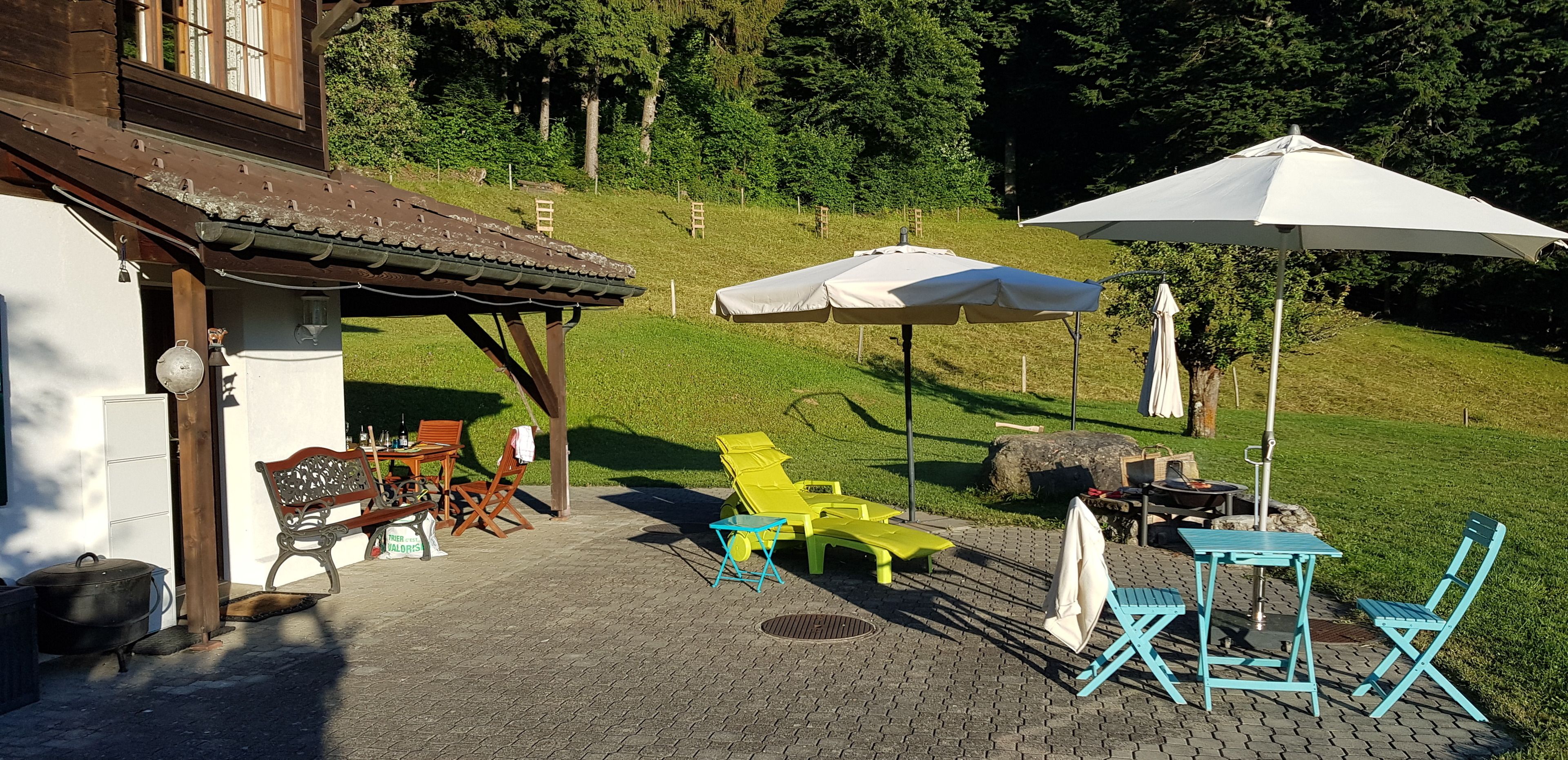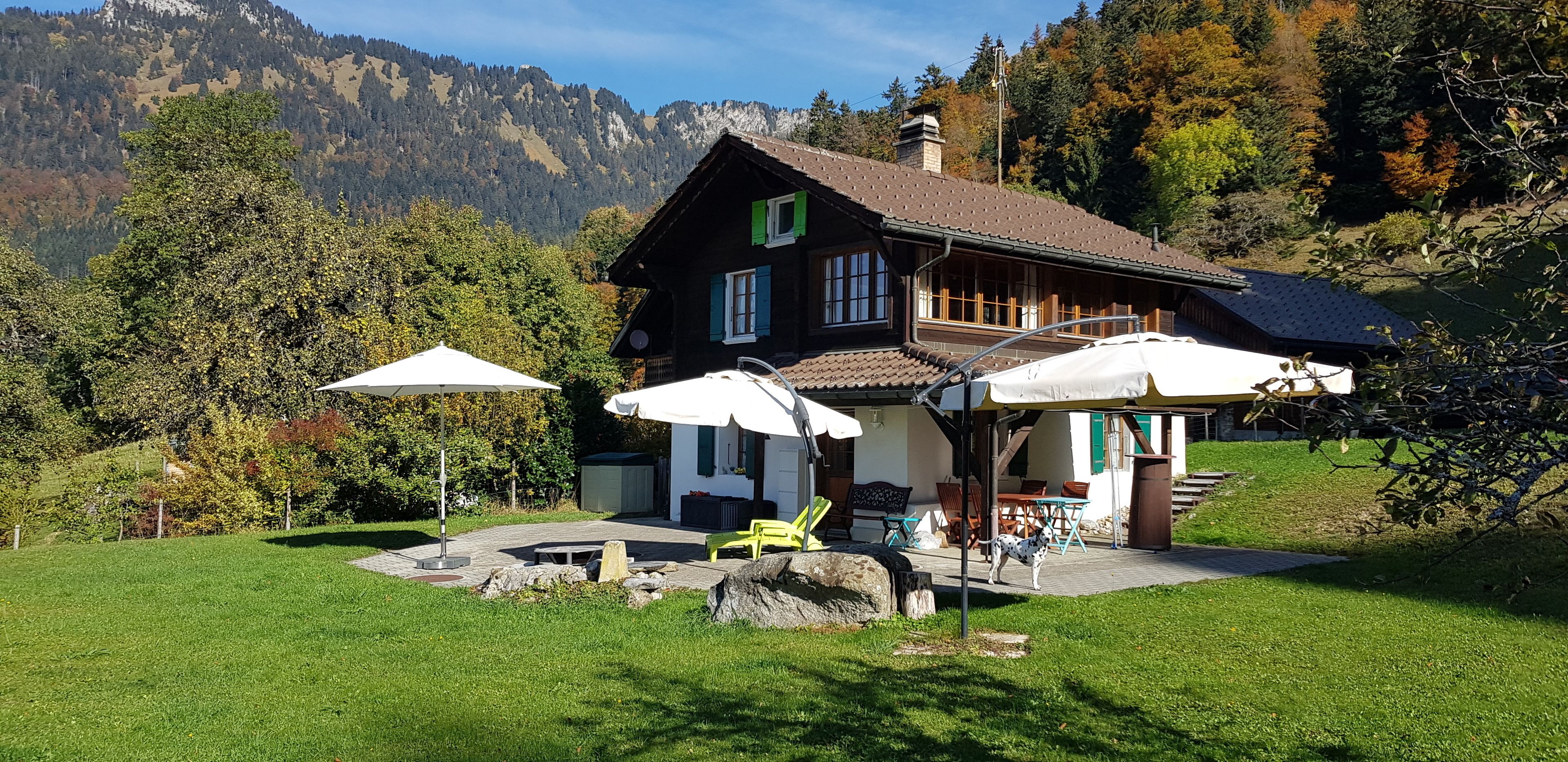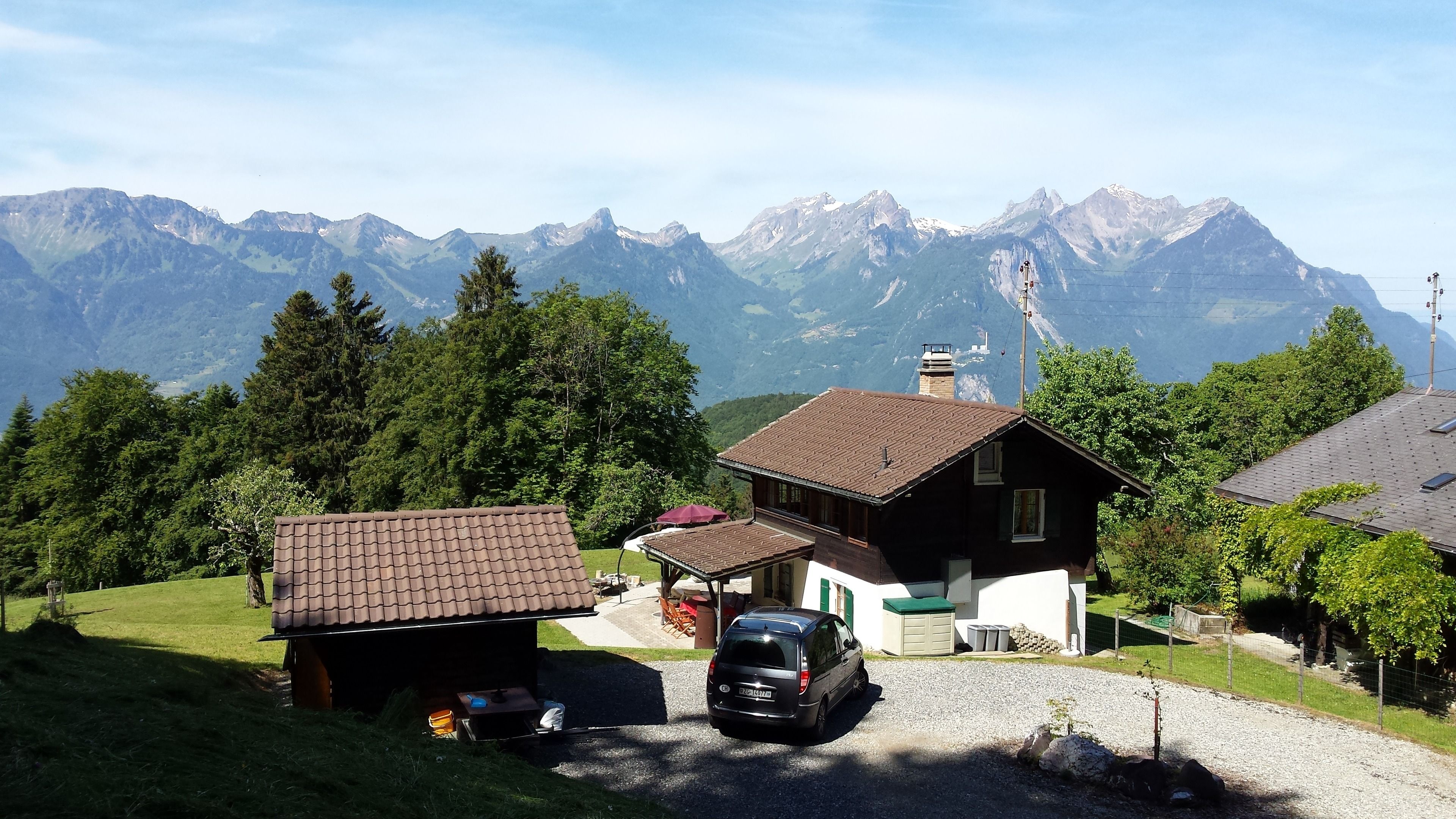 Genfersee | Waadtland | Schweiz: Privates, freistehendes Ferienhaus und Chalet mit drei Zimmern, davon zwei Schlafzimmer, zur Alleinnutzung, für 2–4 Personen. Prächtige Panoramalage auf 1000 m Höhe in Corbeyrier, oberhalb des Weindorfes Yvorne und des Genfersees, nahe Montreux, in den Waadtländer Alpen. Großer Außenbereich mit Sitzplatz, 800 m² gepflegtem, flachen Rasen – ideal zum Spielen und Verweilen – sowie 11.000 m² freie Wiese. Ideal für Liebhaber ungestörter Natur und Ruhe; Wanderwege und Bike-Pisten in direkter Nähe. Winter: nur wenige Kilometer zu den bekannten Skigebieten Leysin, Villars, Verbier, Portes du Soleil, Torgon, Les Diablerets.