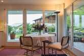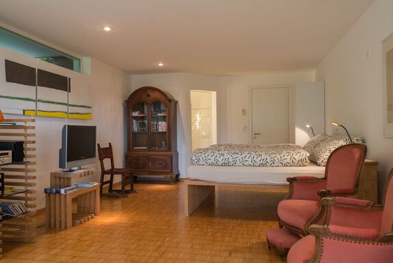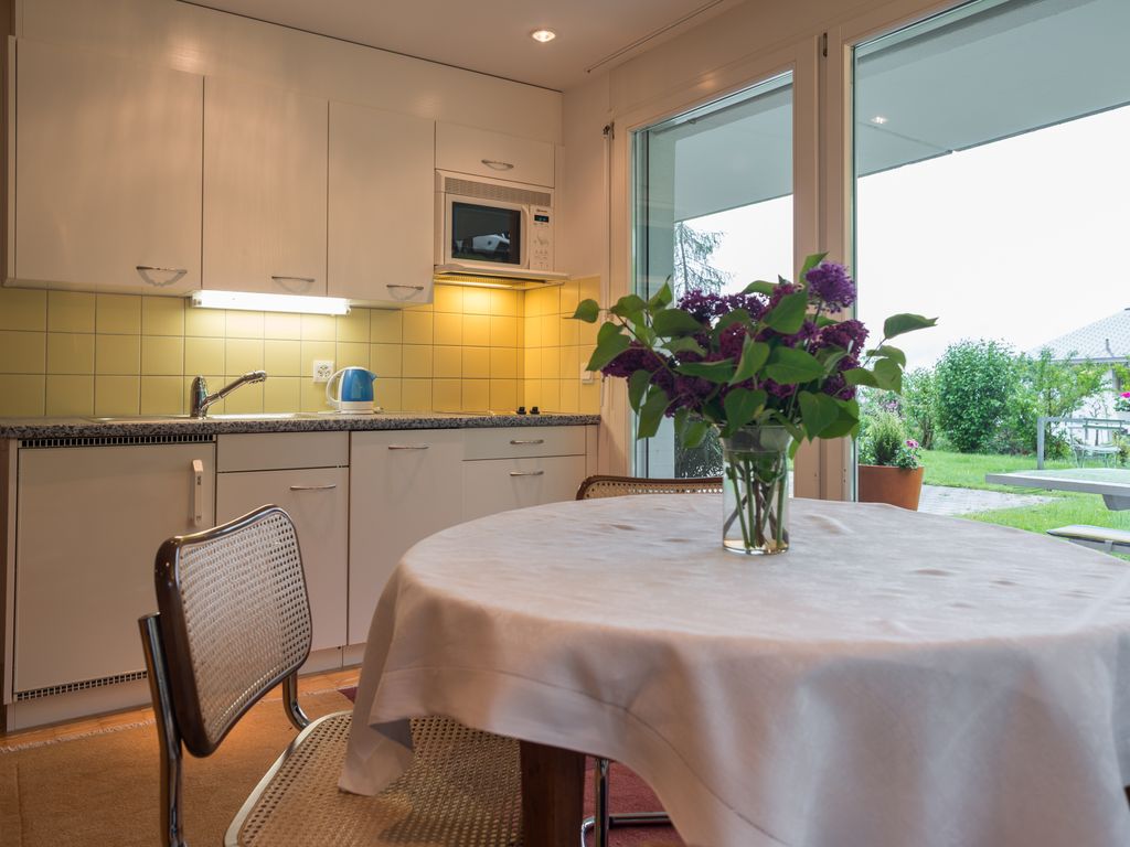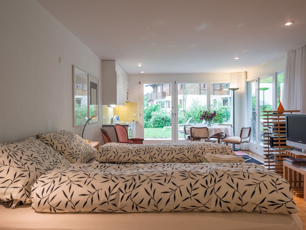 Gemütliche 1 Zimmerwohnung, 34qm (2 Betten) mit Garten und Parkplatz. Ruhige Lage mit Aussicht auf die Berge und den See. Nur 3 Gehminuten zum öffentlichen Hallenbad und Sauna sowie zur Bushaltestelle. Bettwäsche, Frottéewäsche und Küchentücher sind vorhanden, im Endreinigungspreis inkludiert und somit im Totalpreis inbegriffen.