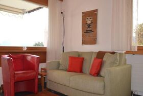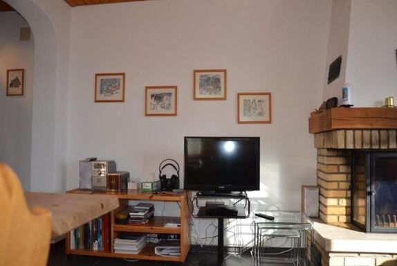 Ein offener Wohnraum zur Küche. Fenster nach Süden (Ausgang zum Gartensitzplatz) und Fenster zur Westseite. Warmluft-Cheminée (Holz steht in der Garage gegen Entgelt zur Verfügung), Esstisch mit Eckbank und 2 Stühlen (2 weitere befinden sich in den Schlafzimmern), Polstergruppe, Klubtische, Flatscreen TV (Kabelfernsehen) und Blue-ray DVD Player, Radio mit CD Player. W-LAN vorhanden.