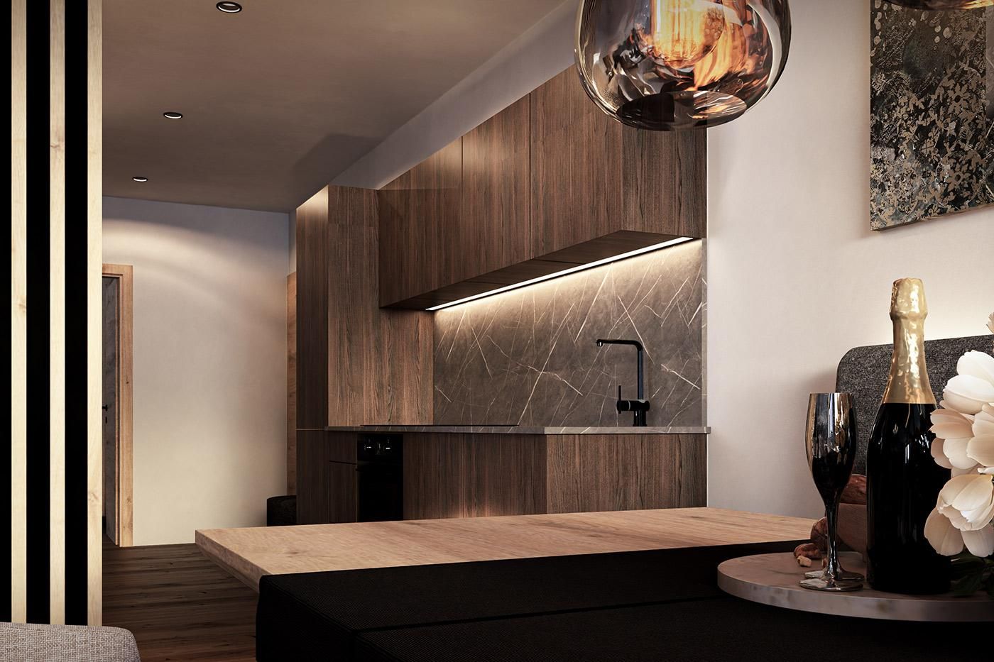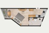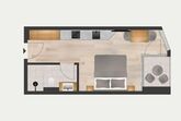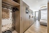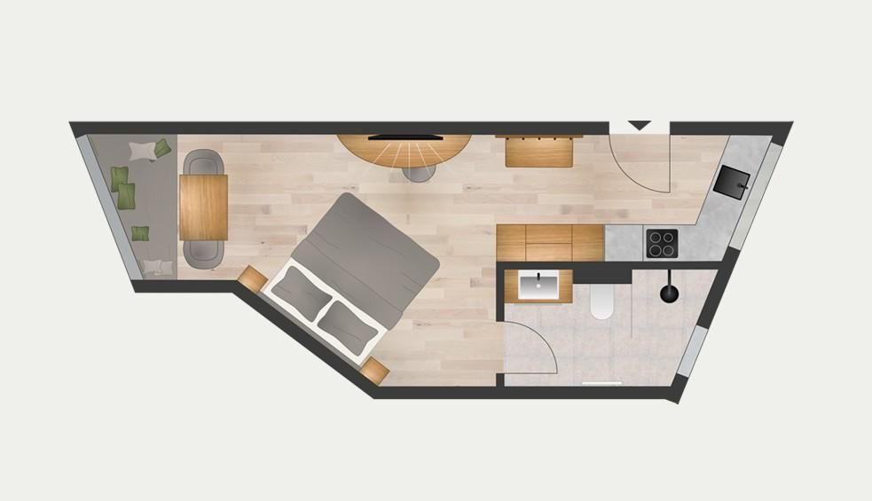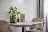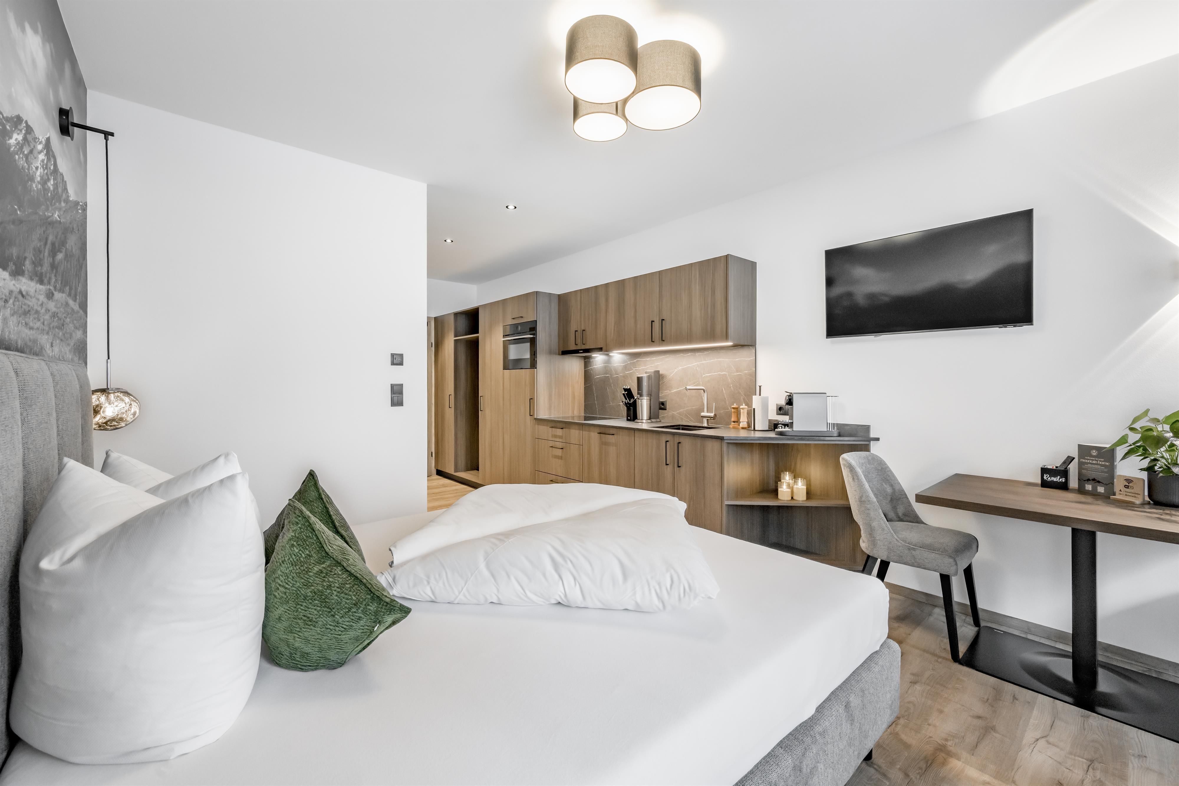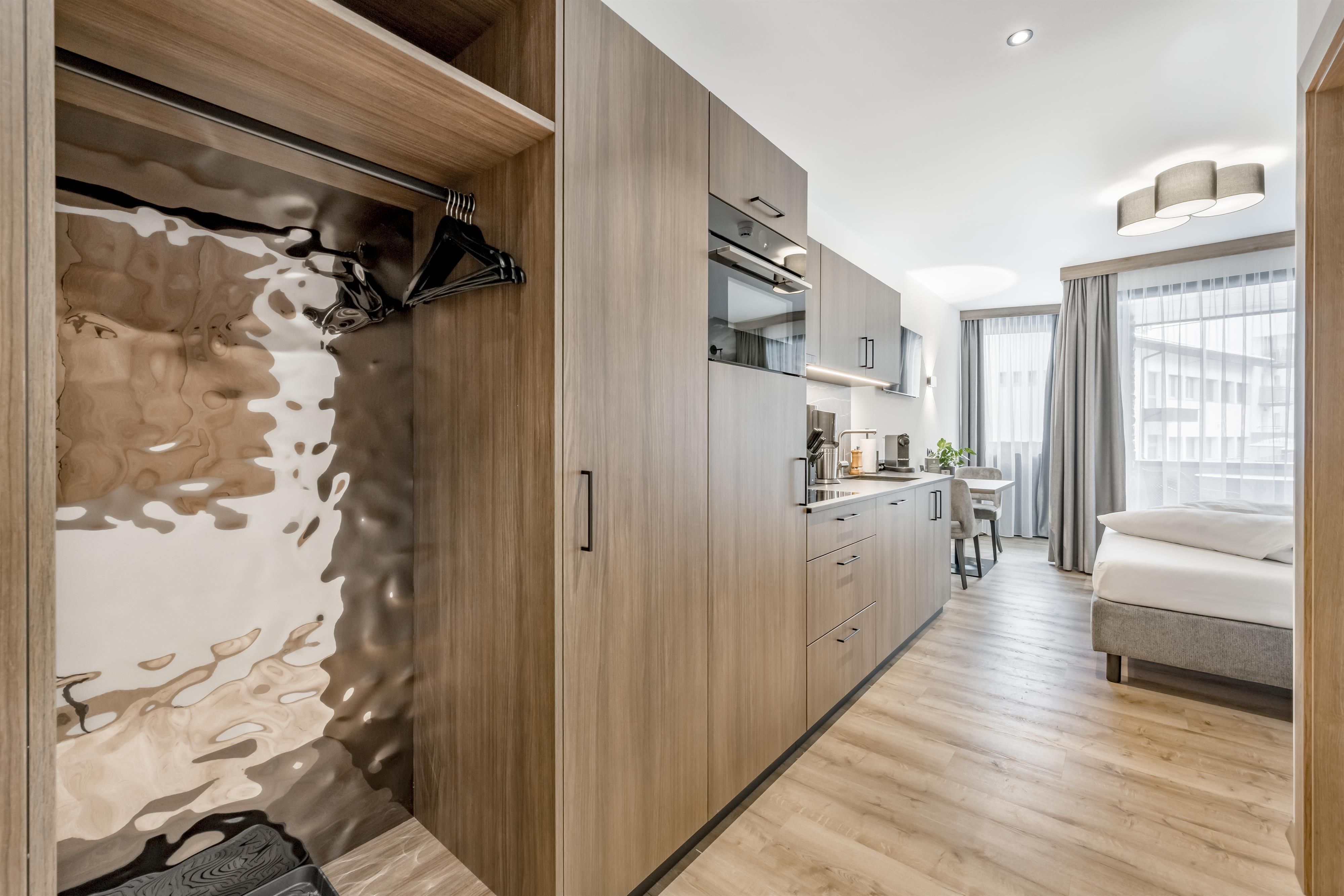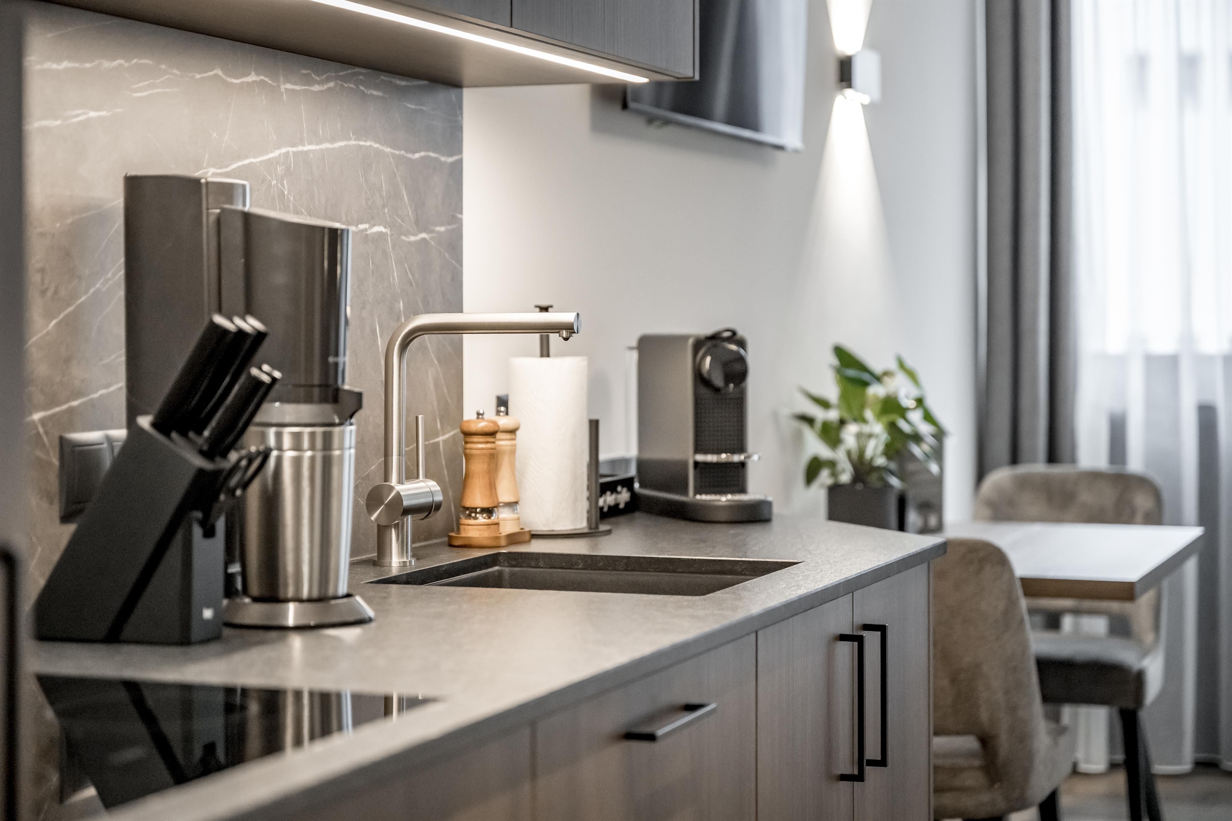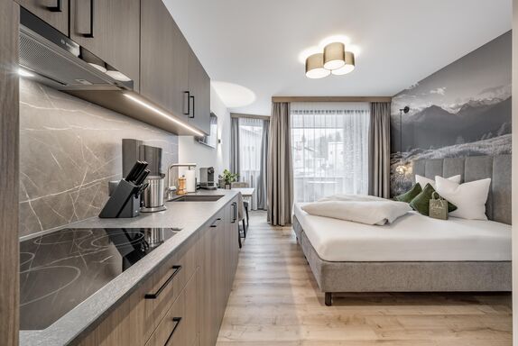 Studio / Einraumapartment mit ca. 24 – 30 m²: Premium-Boxspringbett für zwei, Flatscreen-TV, komplett ausgestattete High-End-Designer-Küchenzeile mit Mikrogrill, Kühlschrank/Gefrierfach, Wasserkocher mit Teeauswahl, Toaster, Soda-Stream, Nespresso-Kaffeemaschine mit Starterpaket, Spülmaschine mit Geschirrtabs, Cerankochfeld uvm. Stylisches Badezimmer mit Regendusche, Haarföhn und WC.