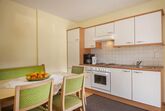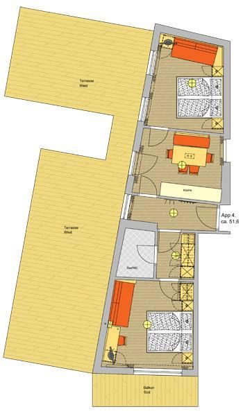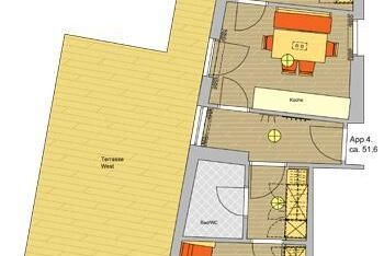 Badezimmer mit Dusche und WC,Komplett ausgestattete Küche , 1. Schlafzimmer mit TV und Balkon, 2. Schlafzimmer mit TV. Duch die nebenan ligende Essküche ist die sehr große Terrase gut zu ereichen. Parketboden im ganzen App.