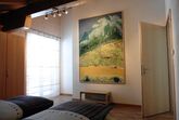 Grosses Zimmer mit Fichtenholz und einem grossen Berggemälde. Zimmer mit Dusche/WC