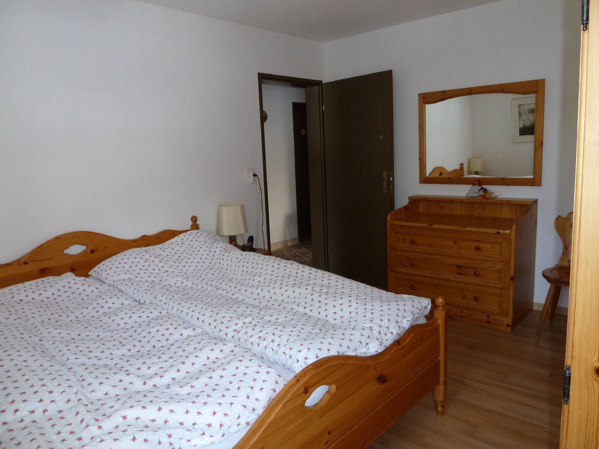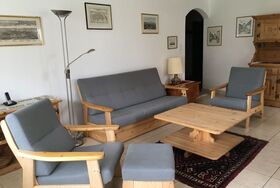 Im Inneren erwartet Sie eine komfortabel eingerichtete Wohnung. Das Wohnzimmer verfügt über eine gemütliche Couchgarnitur, eine Essecke mit Tisch und 6 Stühlen, Fernseher, Radio mit CD-Player und Telefon für Ihren Komfort. Zur Nachtruhe laden ein Schlafzimmer mit Doppelbett, inklusive eingebautem Schrank und Kommode, sowie ein Kinderzimmer mit einem Etagenbett und einem Einzelbett ein. Die Küche ist mit modernen Geräten wie Kühlschrank, Tiefkühlfach, Backofen mit Wärmeschublade, Keramik-Kochfeld und einer Nespressomaschine voll ausgestattet. Ergänzt wird das Ganze durch ein Badezimmer mit Badewanne und Duschvorrichtung, WC sowie ein separates WC.