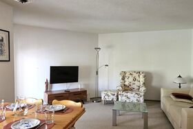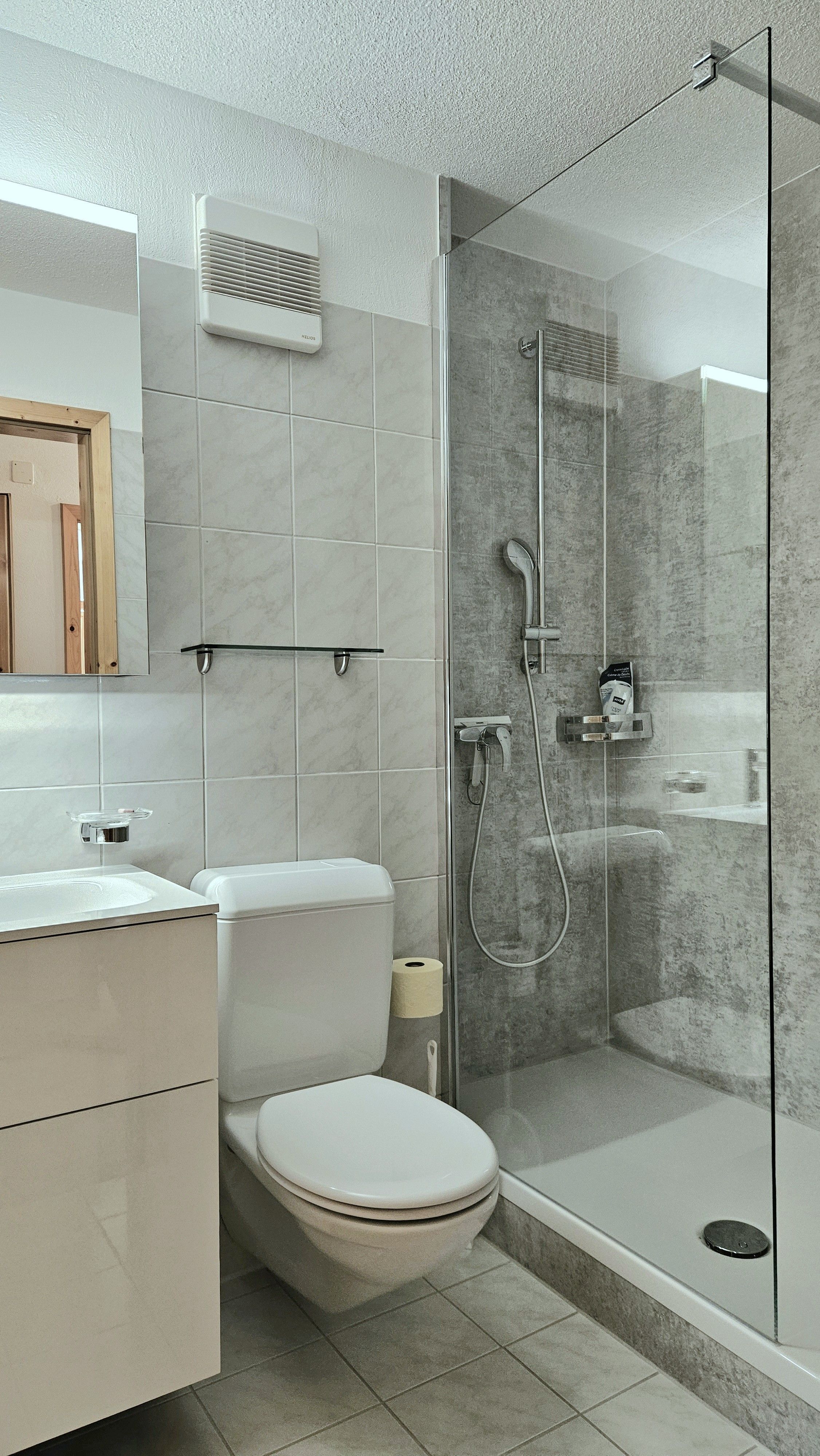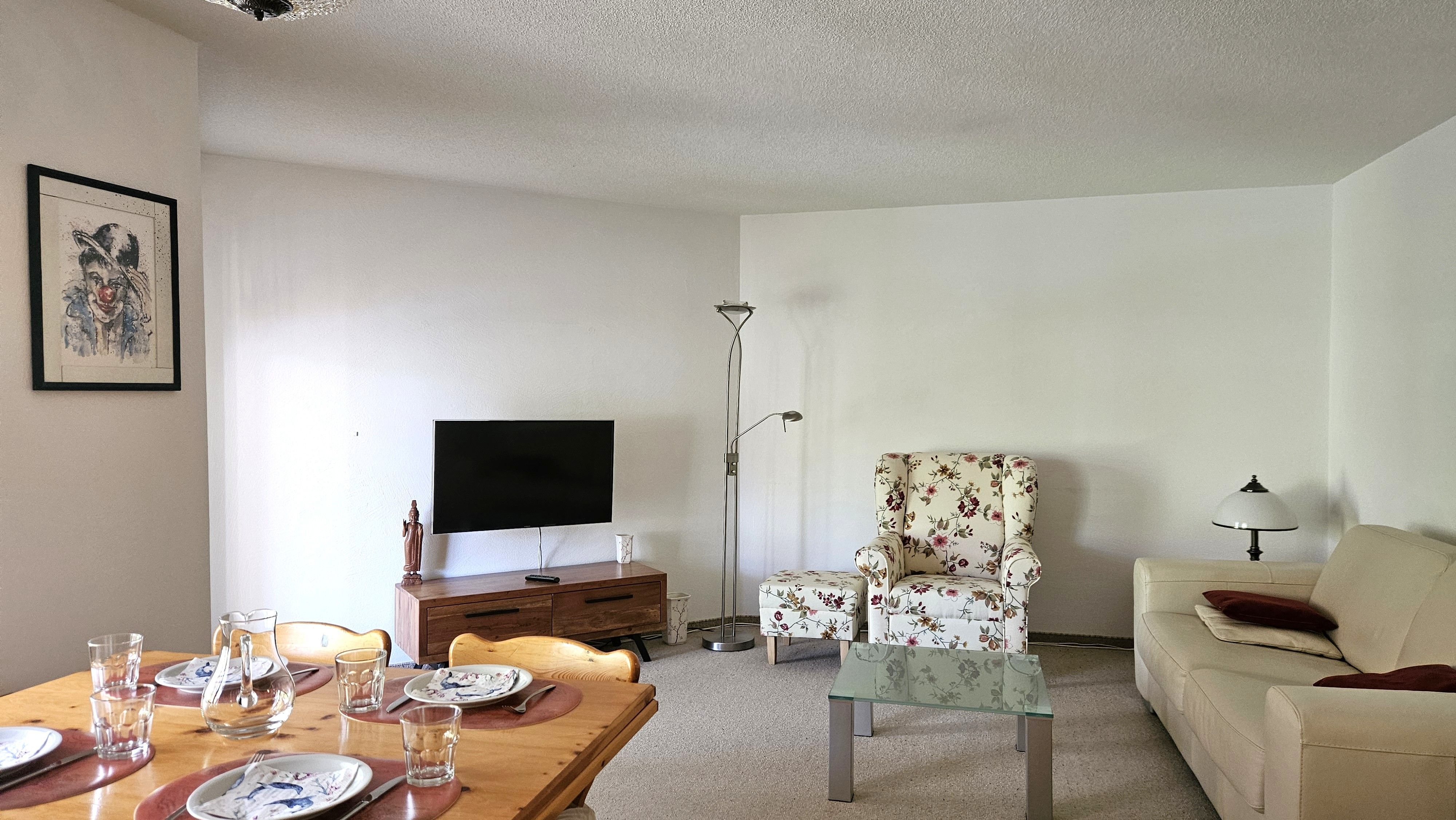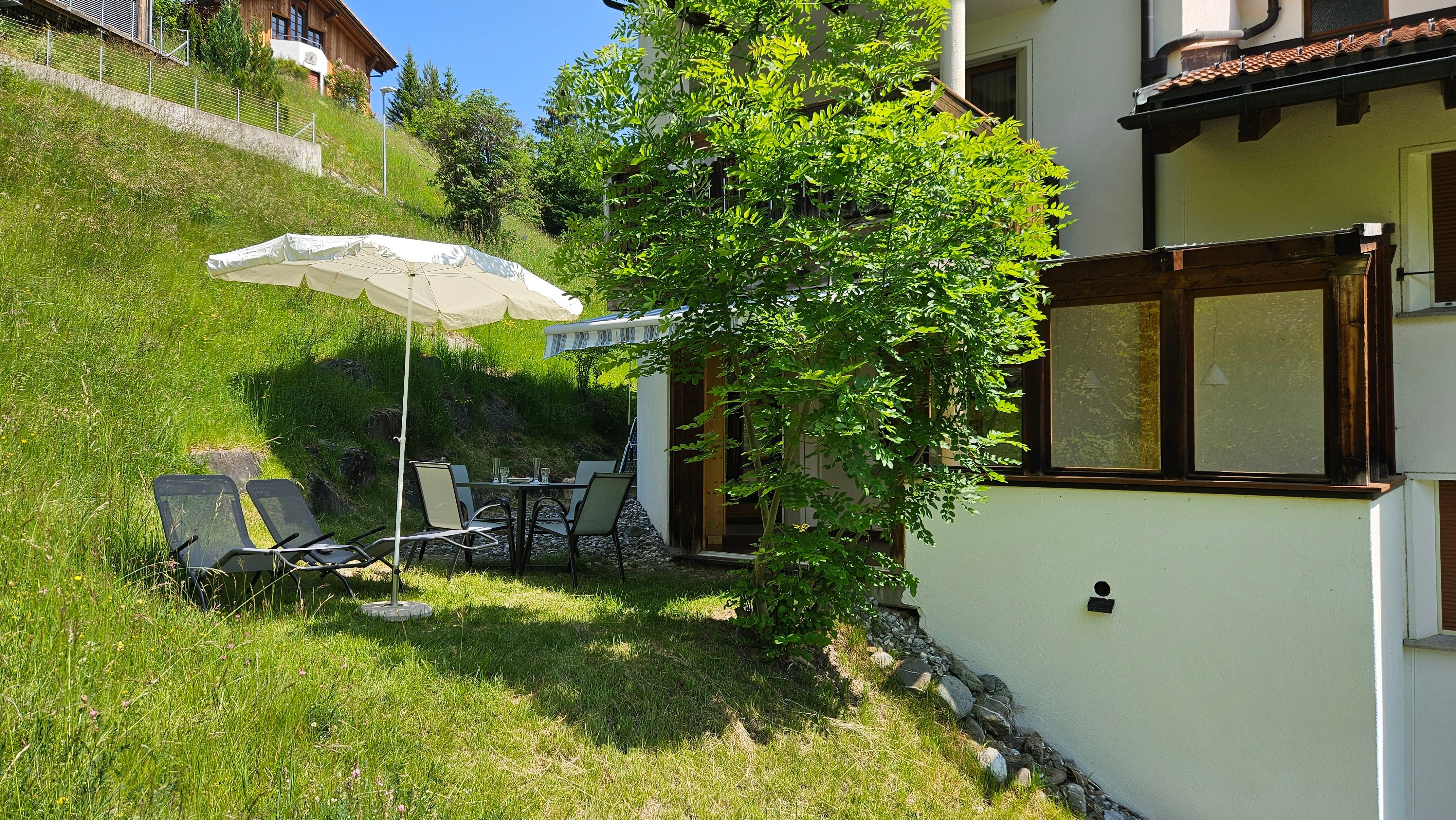 Im Inneren der Wohnung sorgt ein modern eingerichtetes Wohnzimmer mit großem TV, Bettsofa, Polstersessel und Cocktailtisch für Komfort, ergänzt durch den direkten Ausgang zum Wintergarten bzw. zum Gartensitzplatz. Eine gut ausgerüstete Küche mit Glaskeramikherd, Backofen, Geschirrspüler, Fondue Rechaud, Raclette Ofen, Kaffeemaschine und vieles mehr steht bereit, damit sie mit Freude selber kochen können. Ein großer Arvenholz Esstisch und bequeme Holzstühle laden zum gemeinsamen Essen ein. Das Schlafzimmer besticht mit zwei grossen Boxspringbetten (2.2 m x 1.0 m), welche einen erholsamen Schlaf garantieren, und zwei rustikalen Arvenholzschränken. Das moderne WC/Bad mit begehbarer Dusch rundet das Ganze ab.