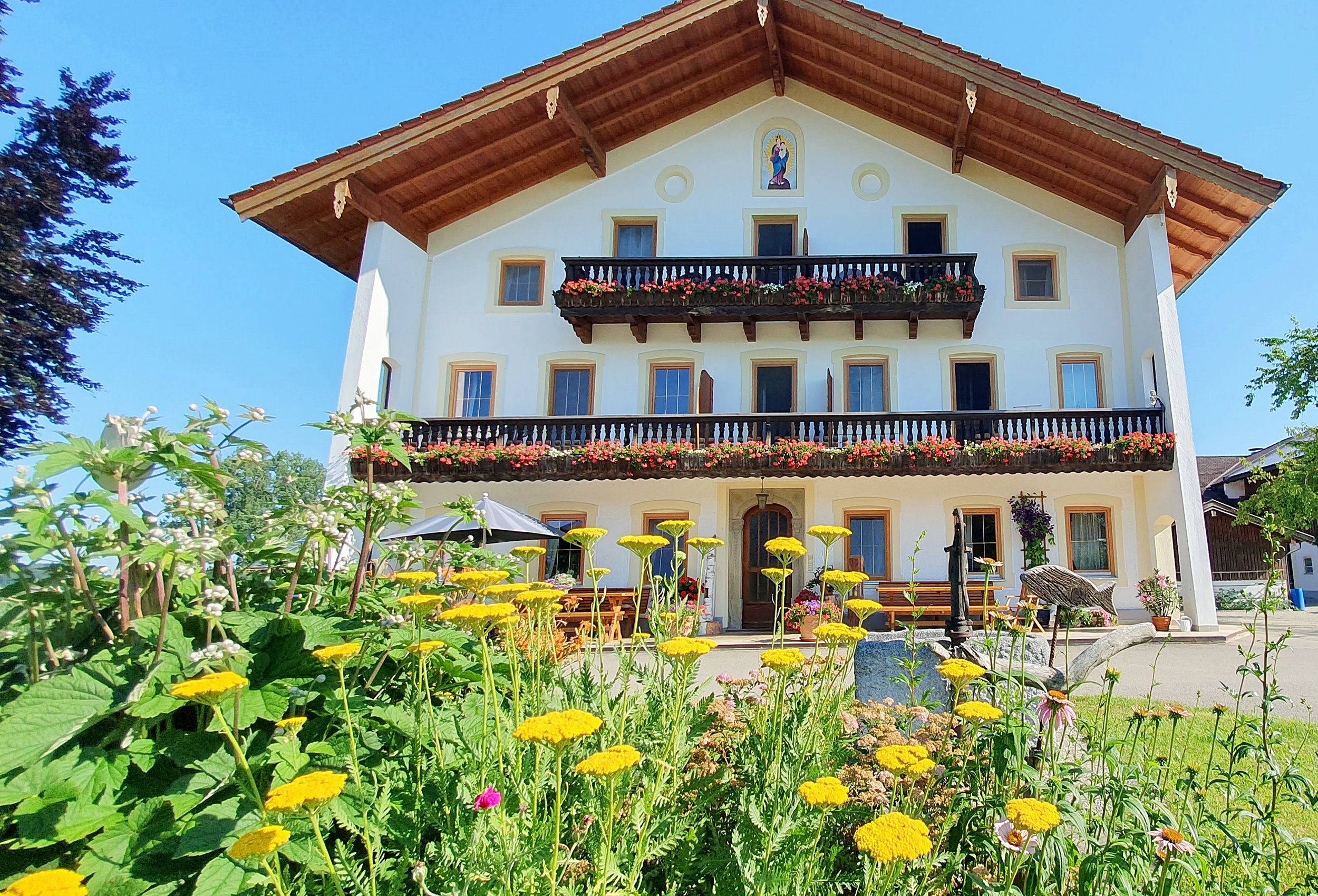 Beim Hofbauer erleben Sie Ihren Familienurlaub auf einem echten und traditionellen, vollbewirtschafteten Bauernhof. Die einzigartige Lage im Landschaftsschutzgebiet des Chiemsees garantiert einen erholsamen Urlaub in traumhafter Umgebung. Die Naturlandschaft rund um den Hofbauer wird Sie ebenso begeistern, wie das nur ca. 2 km entfernte Chiemseeufer. Die Lage hat einen weiteren Vorteil: Ihre Kinder können sich bei uns austoben, während Sie sich entspannen, denn es gibt bei uns so gut wie keinen Verkehr. Ganz in der Nähe unseres Bauernhofes gibt es viele Möglichkeiten für diverse Freizeitaktivitäten, wie z.B. Radfahren, Wandern, Baden oder Spazierengehen. Auch die Ausflugsziele der Region sind schnell und einfach zu erreichen. Wir bieten Ihnen 6 Ferienwohnungen, die gemütlich eingerichtet und für Familien oder Paare geeignet sind. Ein Urlaub auf unseren Bauernhof wird für Ihre Kinder zum Erlebnis! Es stehen ein Spielplatz mit Riesenrutsche, Trampolin, Kettcars und ein Spielzimmer zur Verfügung. Tiere dürfen auf einem Bauernhof natürlich nicht fehlen! Bei uns gibt es Kühe, Ziegen, Enten, Hühner und Katzen, die alle umsorgt werden wollen. Ihre Kinder können uns dabei gerne helfen. Weitere Information über einen Urlaub auf unserem Bauernhof finden Sie auf unserer Website. Klicken Sie dazu einfach oben auf den Link Homepage